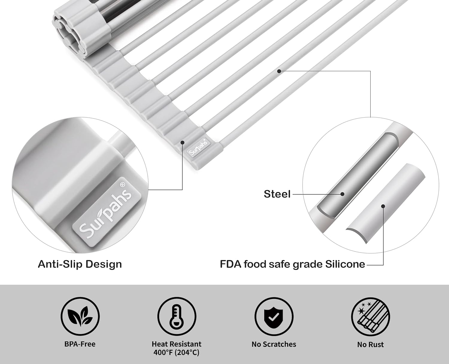 Surpahs Over Sink Foldable Multipurpose Roll-Up Dish Drying Rack, Silicone Wrapped Stainless Steel, Warm Gray, 20.5" x 13.1"