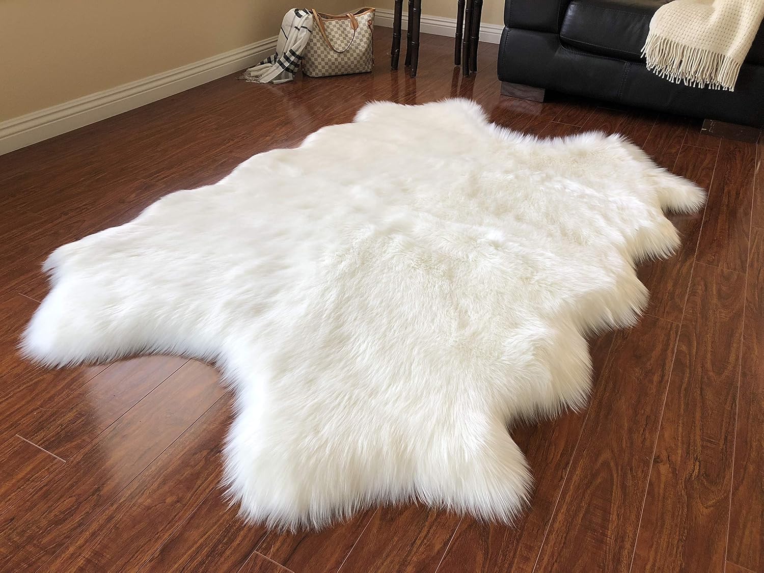 - MULTIPURPOSE DESIGN REAL SHEEPSKIN RUG: The sheepskin rugs are multipurpose and used as seat covers rug, couch pads, and area carpets. The stain-resistant, latex-free rug is designed for daily indoor use faux fur that is a super soft material rug under your feet. This free shape silky shag rug that works with a wide variety of decors great addition for kid’s room rug.