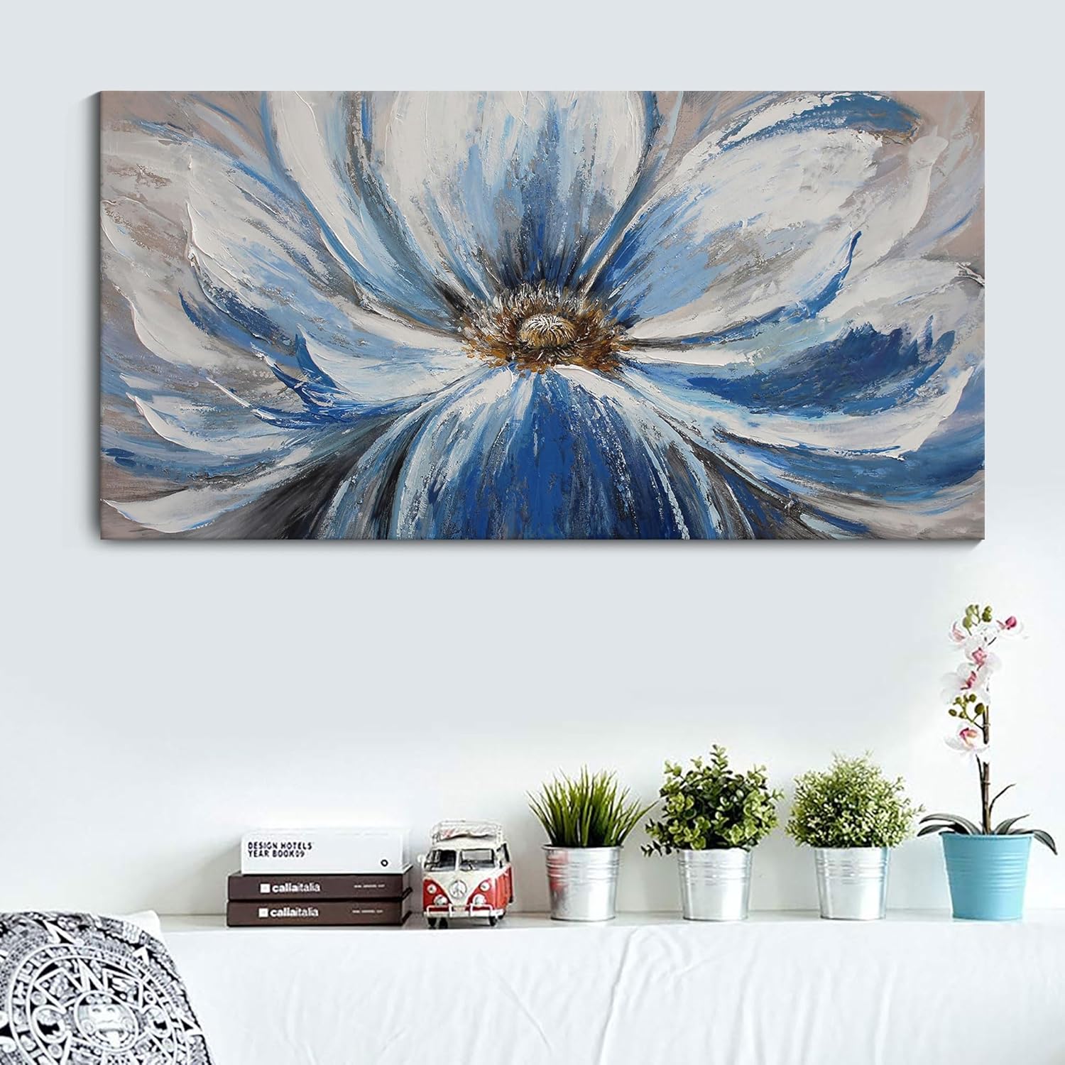 Flower Canvas Wall Art for Living Room Large White Blue Flower Picture Giclee Print Painting Wall Decor Framed Artwork Ready to Hang for Home Bedroom Wall Decoration Size 24x48