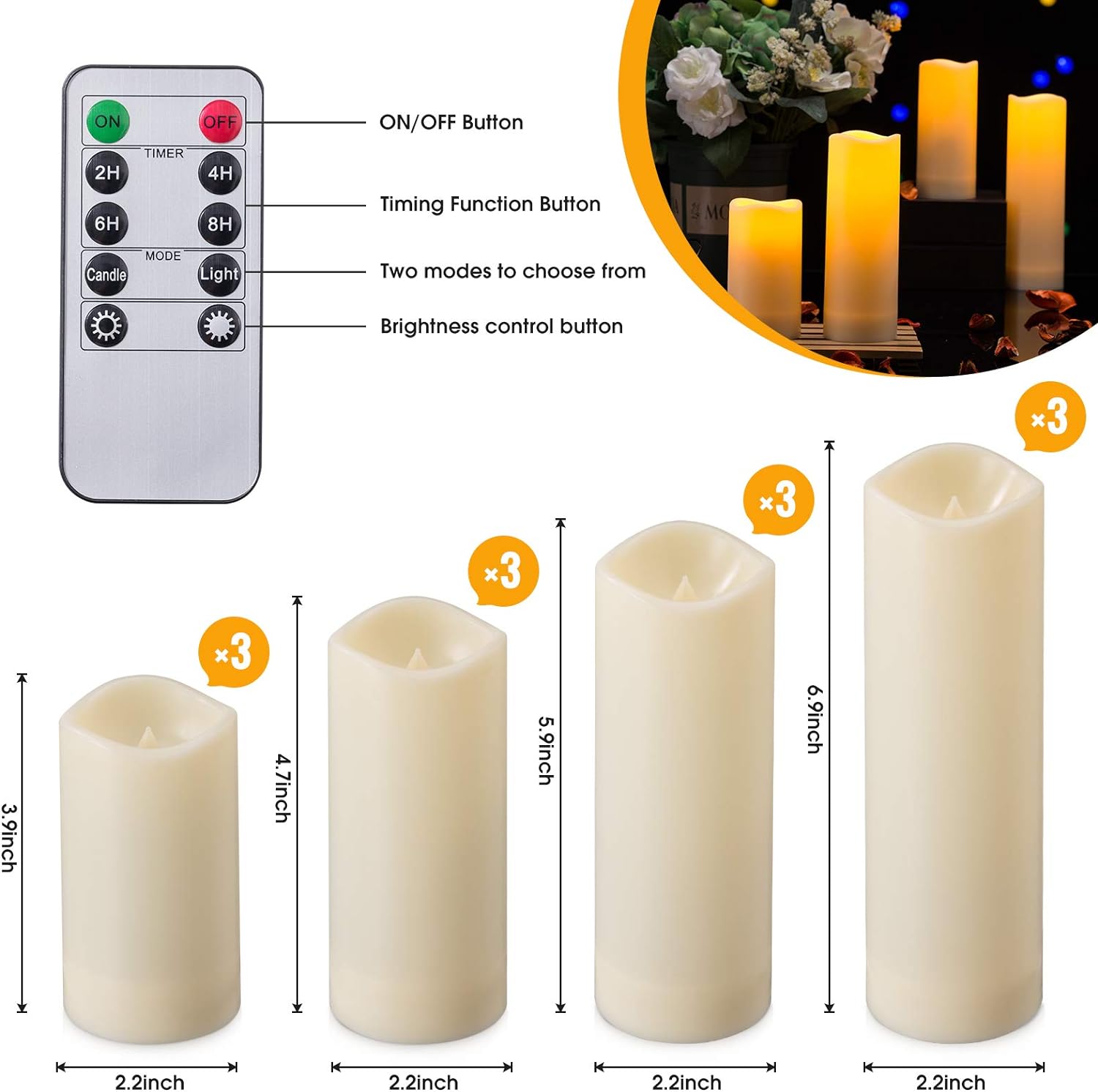 - EXQUISITE 12 PIECES IN 4 SIZES - This value for money set of 12 lovely outdoor flameless candles with 2 remote controls (D: 2.2 inches, H: 4 inches / 5 inches / 6 inches / 7 inches). The size is almost the same as a champagne glass or a traditional tulip glass. The real candles is slightly smaller than the picture. The amazing 10-key remote gives more choices for brightness, modes (flicker/solid light) and a specific timer.