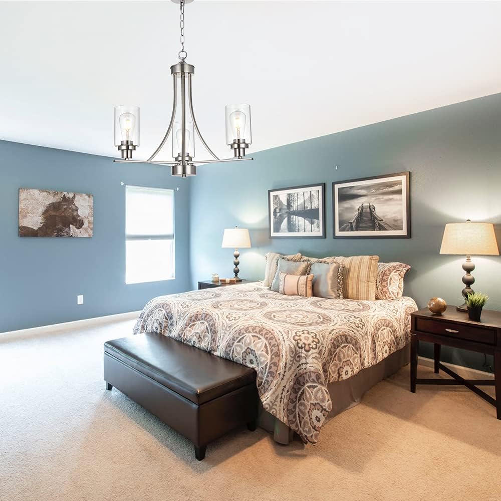 - 💠 3 Light Modern Glass Chandelier: This rustic kitchen dining room chandelier with high clear glass shades,it is an elegant update for traditional and modern homes alike.It's the perfect light fixture to install in kitchen, island, dining room,living room,foyers ,hallway,bedroom,coffee bar, lobby, restaurant and any space you like.