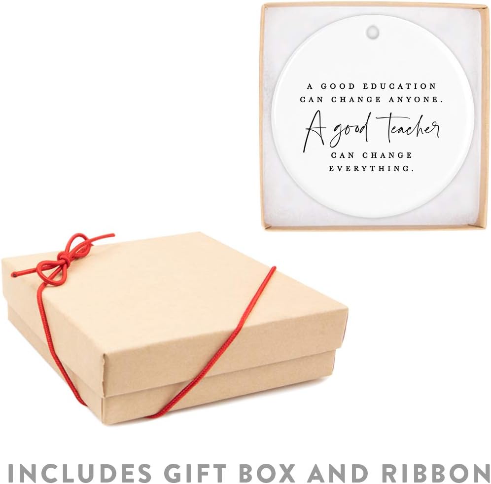 Andaz Press Round Ceramic Porcelain Christmas Tree Ornament for Teacher Thank You Appreciation Graduation Gift, A Good Education Can Change Anyone. A Good Teacher Can Change Everything., 1-Pack