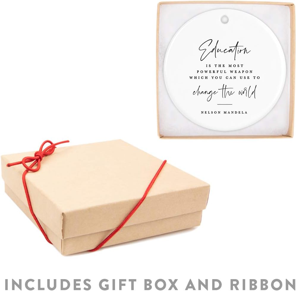 Andaz Press Round Ceramic Porcelain Christmas Tree Ornament for Teacher Thank You Graduation Gift, Education is The Most Powerful Weapon Which You can use to Change The World, Nelson Mandela, 1-Pack