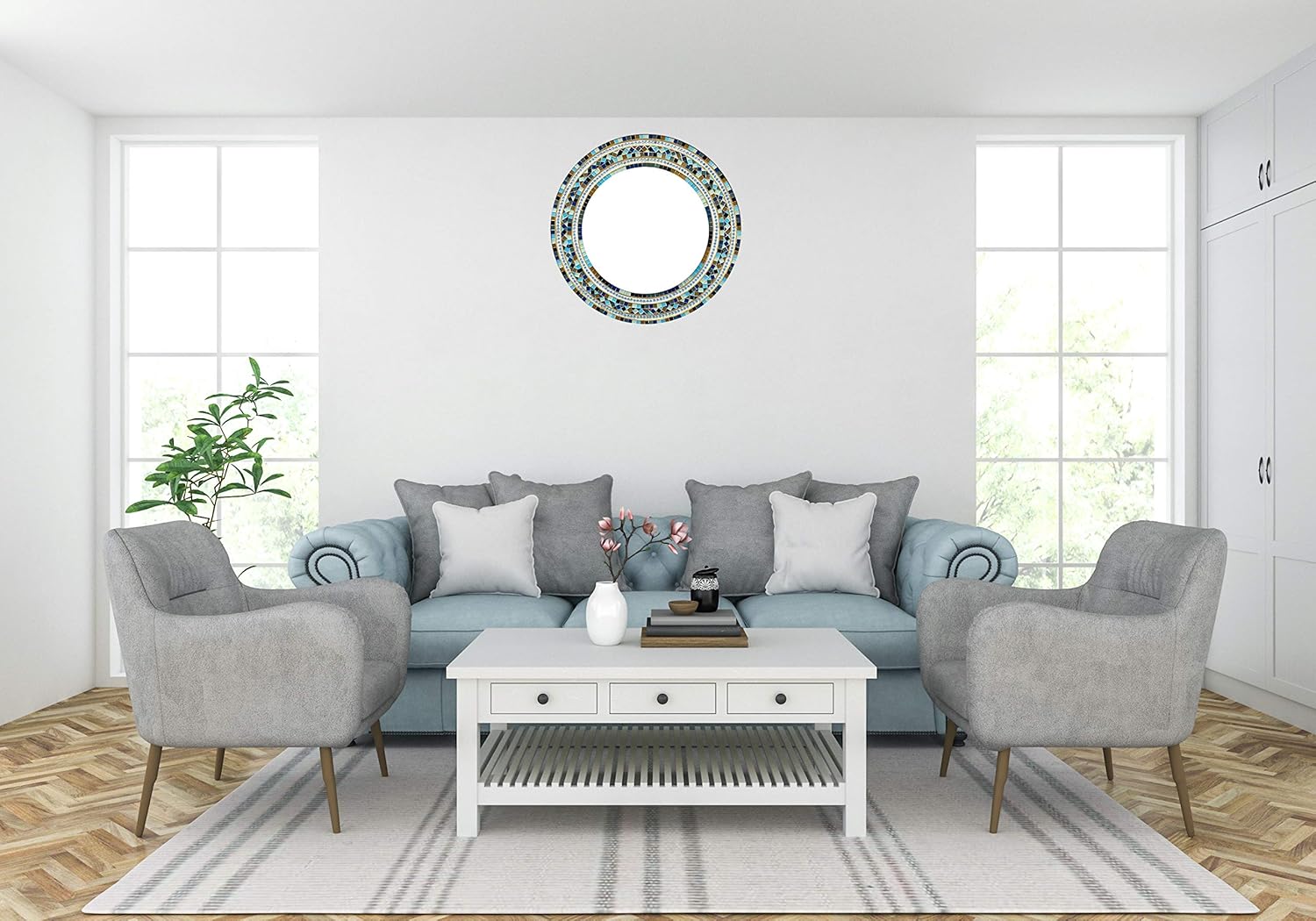 Mosaic Mirror, Wall Art Décor – Handcrafted Decorative Wall Mirror, Light and Navy Blue, Brown, Gray, and Black Round Mosaic