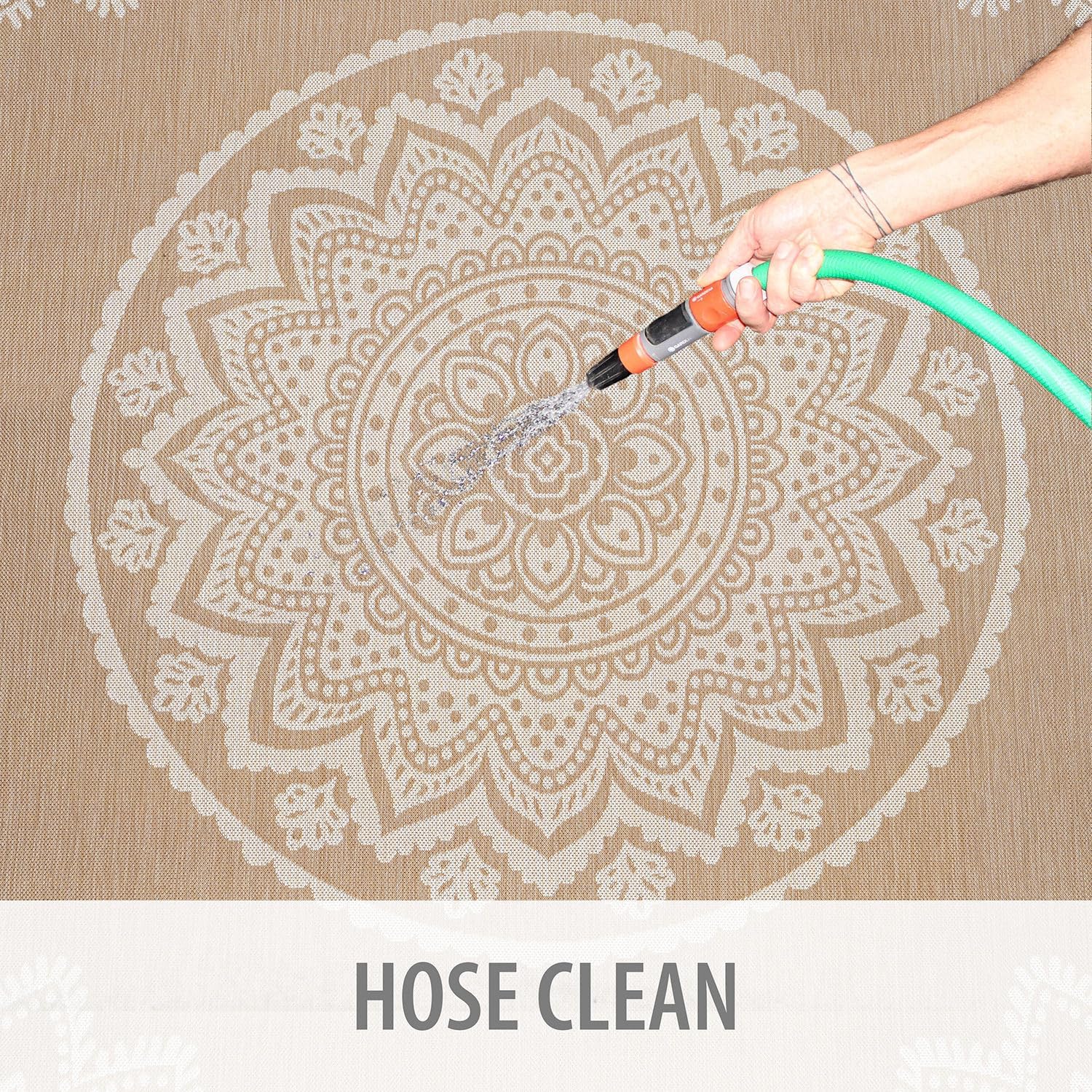 - [ WASHABLE: ] You can vacuum with a vacuum cleaner indoors and you can wash with a hose outdoors. To wash an outdoor rug, spray the surface with a 5-1 mixture of mild dish soap and water and then rise with a hose.