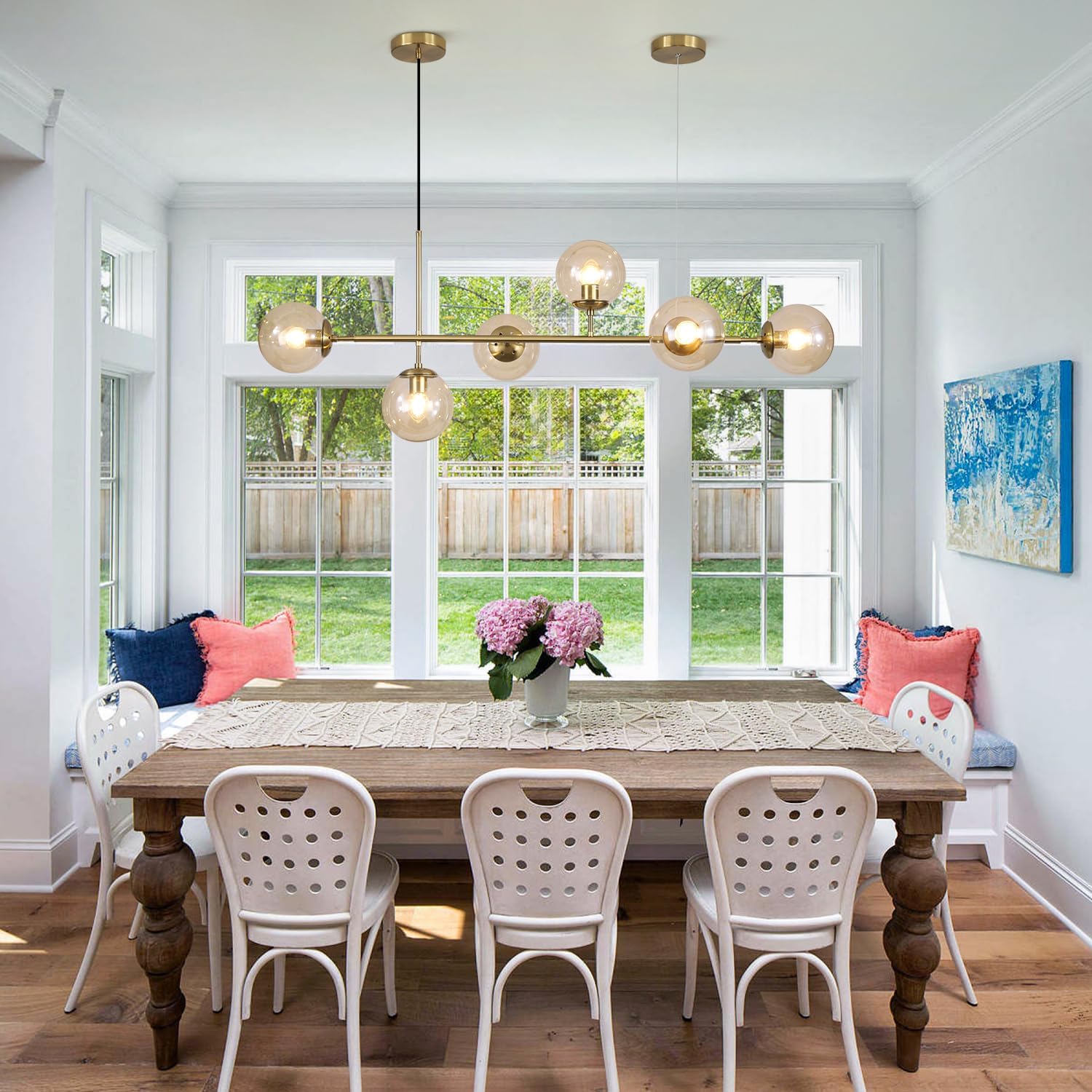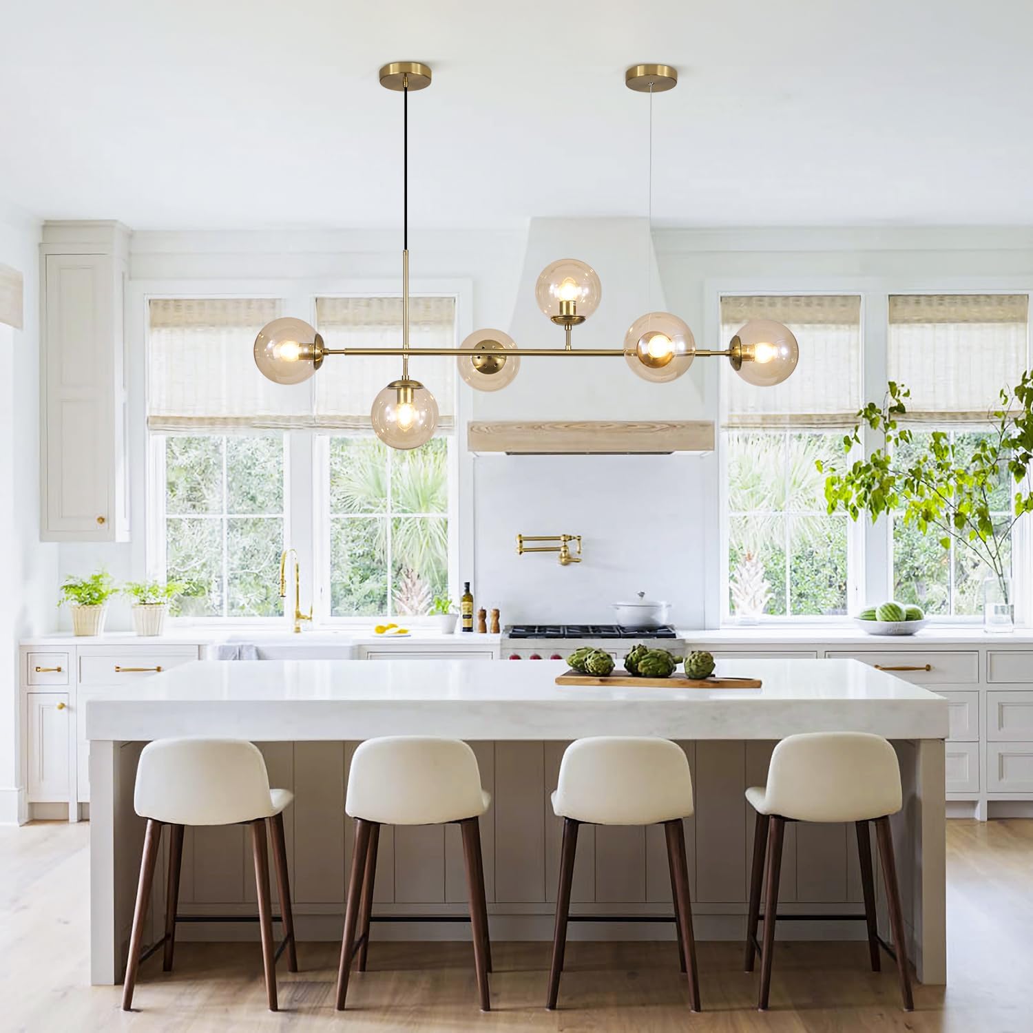 - Creative Design: The gold and glass island lights for kitchen island features six amber glass shade and a long metal frame, which is characterized with a modern flair. The amber glass shade diffuse the light to create a welcoming glow, adding a retro modern accent and ample illumination