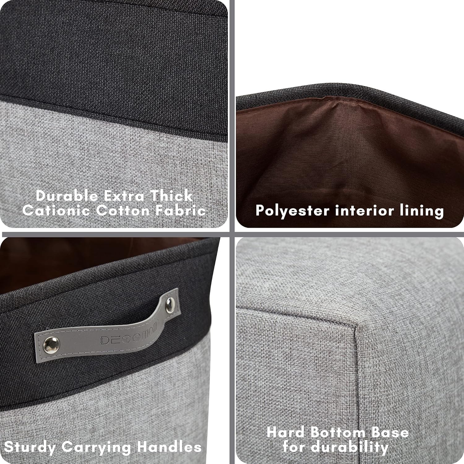 - Premium Material: DECOMOMO's bins feature a sturdy metal frame, extra thick EVA exterior, polyester interior, 2.5mm MDF fiberboard bottom, and faux leather handles capable of holding up to 25 lbs.
