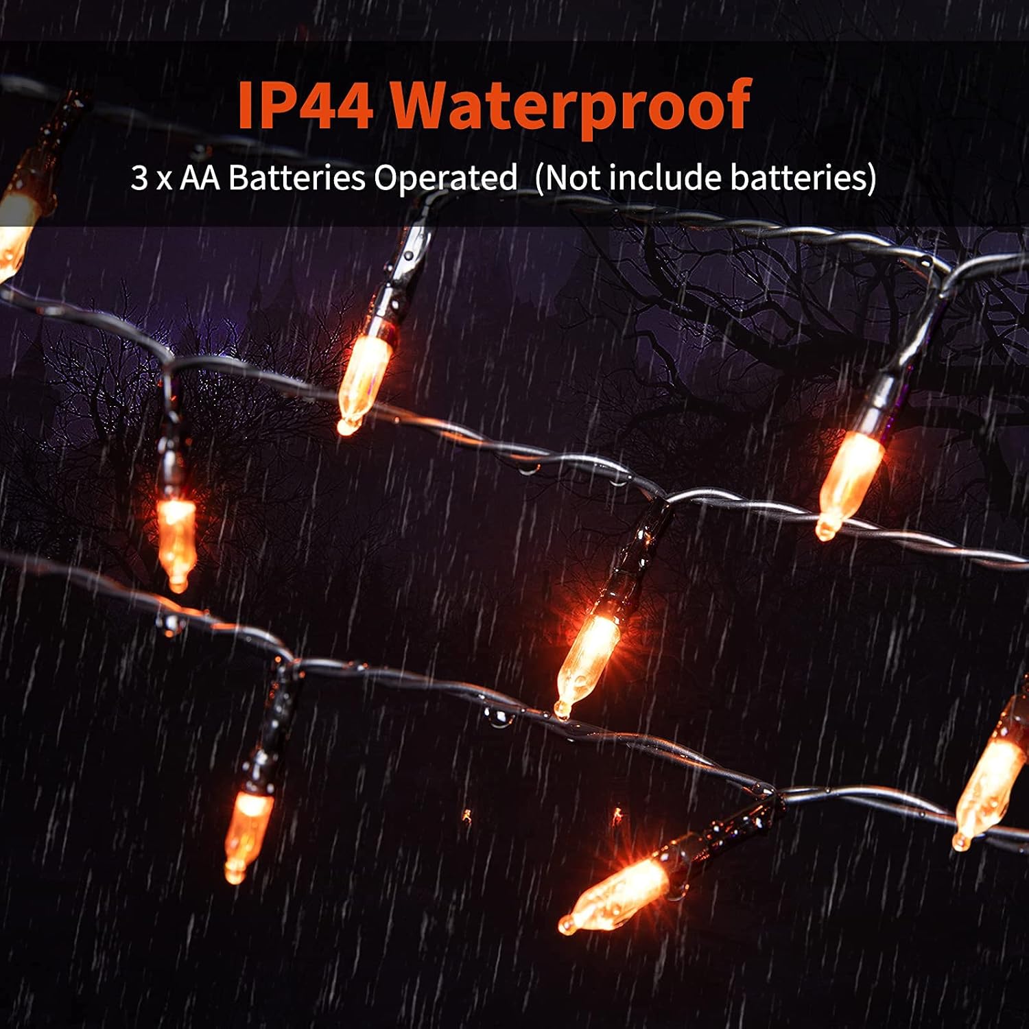 - Battery Operated Halloween Decorations: 3 “AA” batteries (NOT included) operated, 50 LED Halloween decor orange string lights, water resistant battery case, amazing match for the haunted stuff like skeleton, ghost, witch hat and more. Portable for outdoor camping, festival decor
