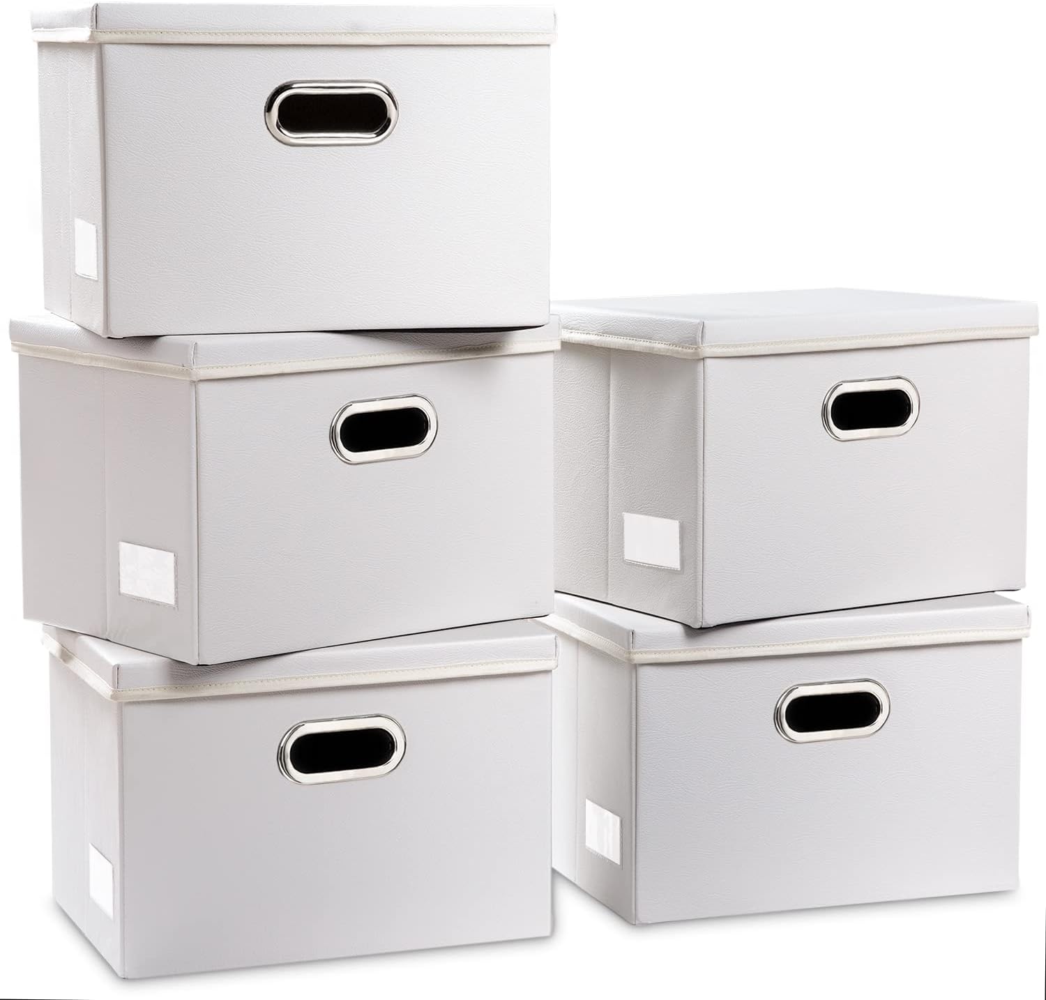 PRANDOM Foldable Storage Bins with Lids [5-Pack] Leather Fabric Collapsible Storage Boxes Organizer Containers Baskets Cube with Cover for Bedroom Closet Office Nursery White (14.9x10.8x10)