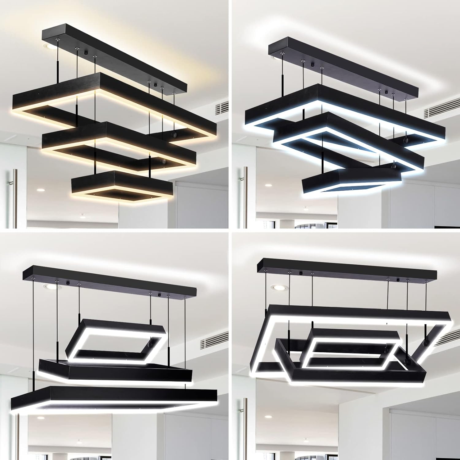 - 【LED Chandelier Modern Pendant Light in Many Shapes】This black modern pendant light with adjustable strings via cable locking pin, hang modern pendant lights for the dining room; DIY before installation and choose your favorite shape; strings can be Adjustable 51.18 inches, perfect for your ceiling height; the 3 rectangular rings of the modern led chandelier can be adjusted at will, making your lighting decoration timeless
