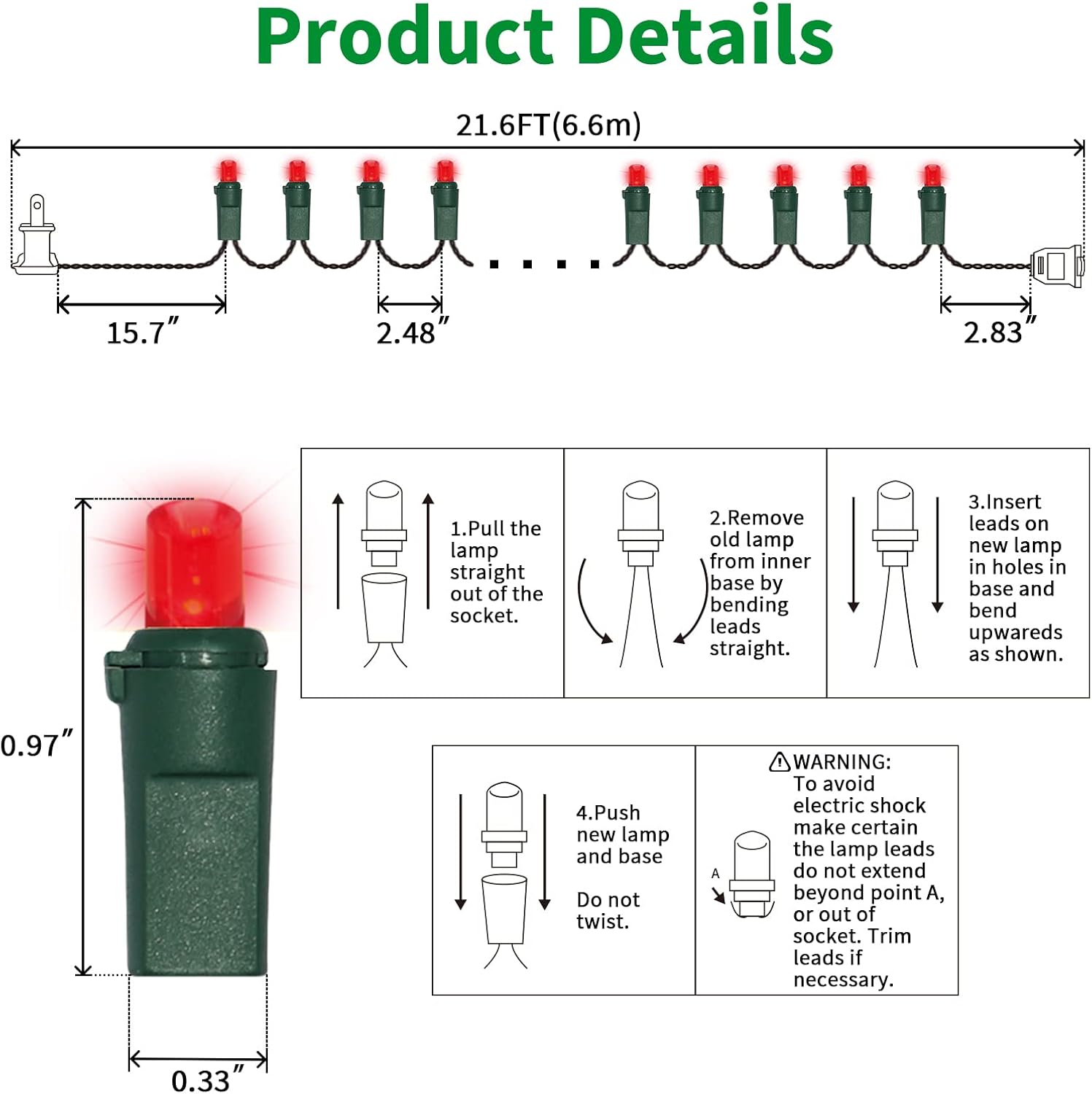 - 5mm LED Christmas Lights: 100 counts warm white 5mm wide angle stable LED string lights spaced 6.3 inches apart with green wire. 7.1 inch leads have a stackable male plug and 5.9 inch tails have a female plug for easy end to end connection.