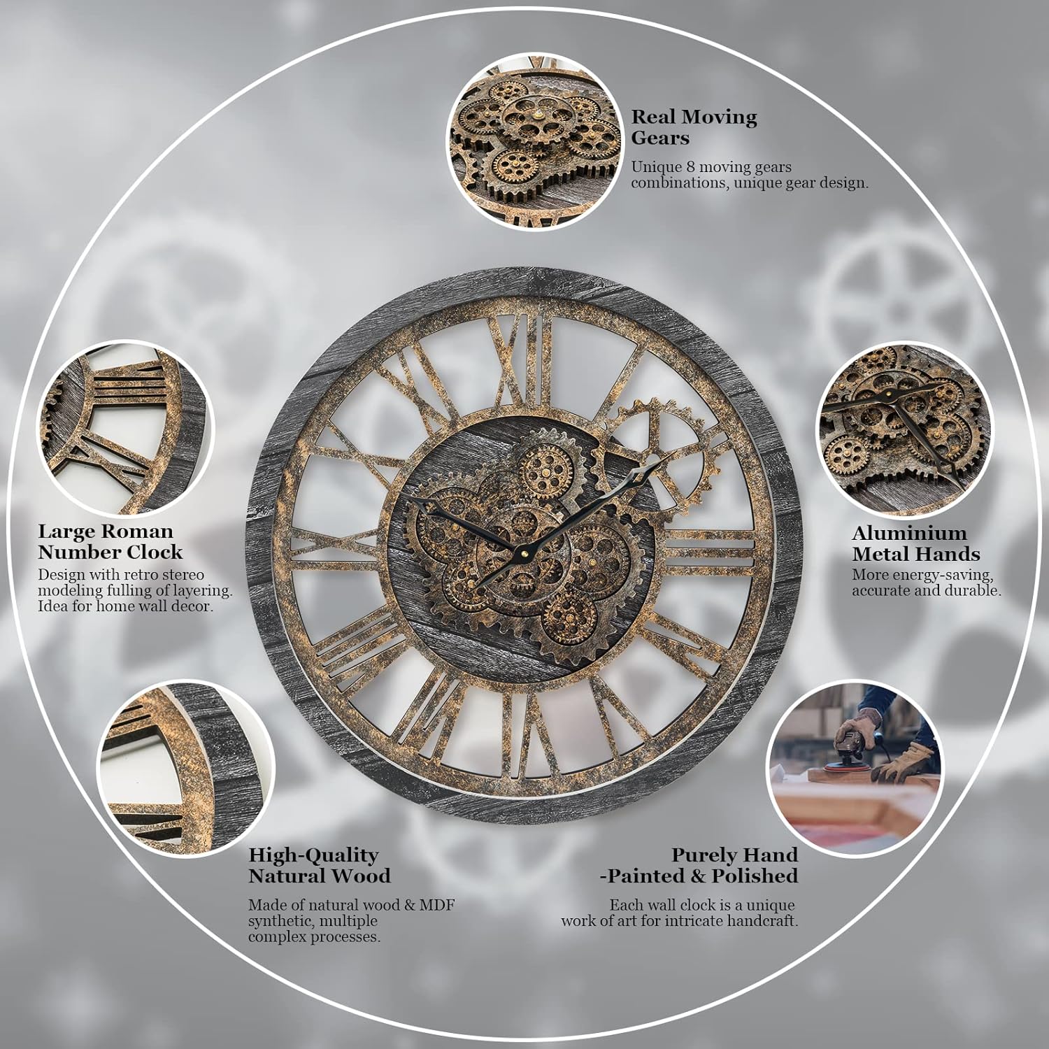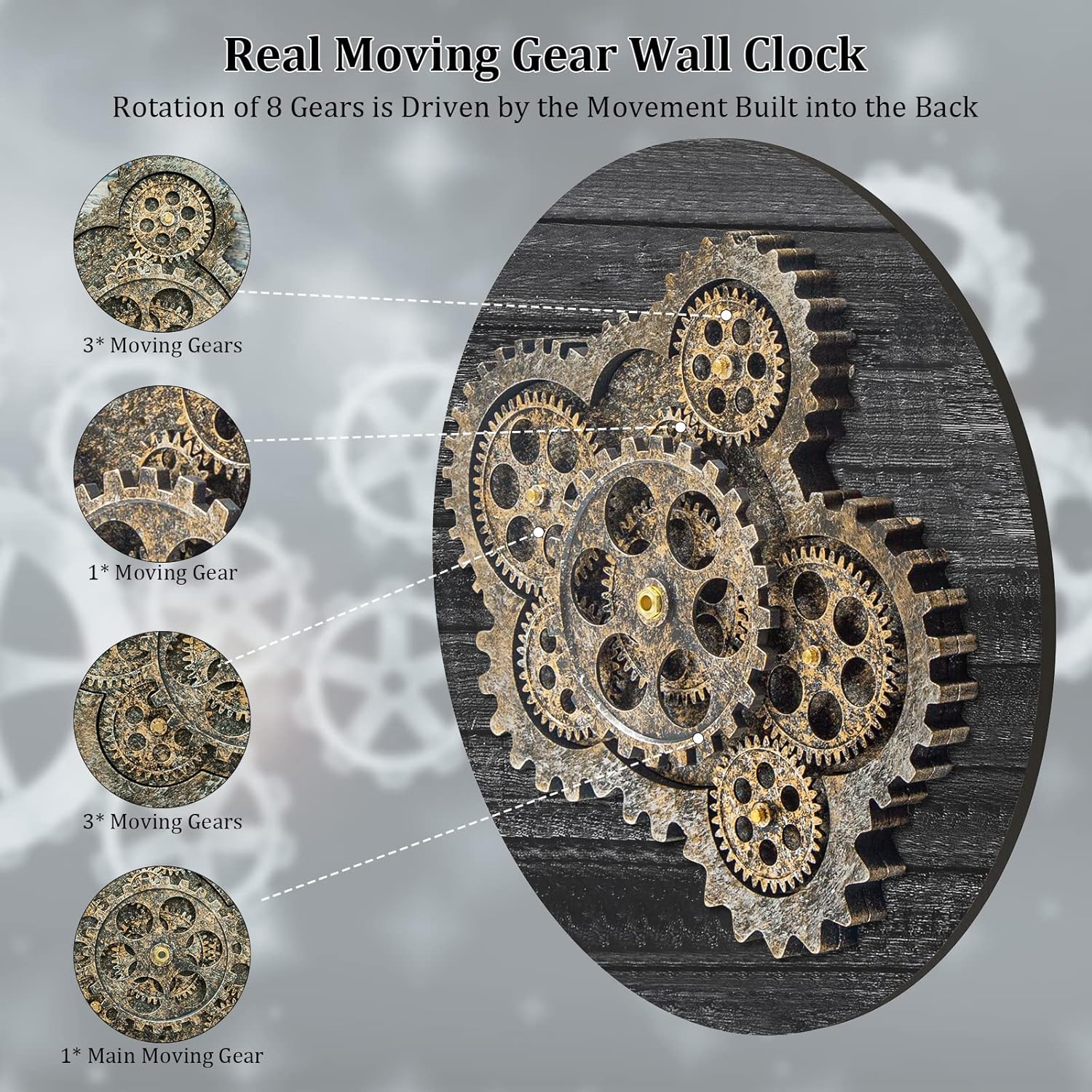 - ăReal Moving Gear ClockăAll gears for the wall clock are real moving! Design with rustic bronze-color and industrial style. An creative combination of four gears for a retro look, has a very exquisite decorative effect makes the wall clock become a chic art works. The large wall clock crafted of nature wood & MDF. Big roman numeral numbers and wood rustic moving gears perfect for any room decor.
