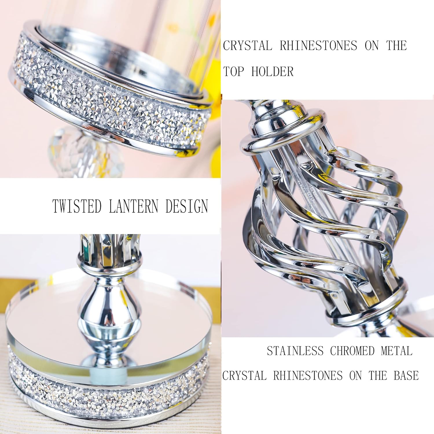 - 【Crystal + Metal Design Candle Holder】 This pillar candle holder is made of stainless chrome metal,both the top and bottom are decorated with crystal rhinestone, it is designed with shiny crystal elements to make it looks more classic and beautiful!