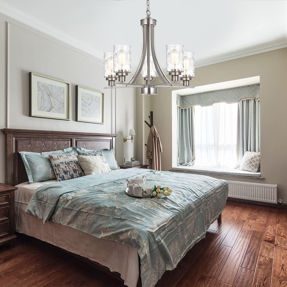 - 💎5 Light Glass Chandelier: This contemporary chandelier with high clear glass shades,it is an elegant update for traditional and modern homes alike.It's the perfect light fixture to install in kitchen, island, dining room,living room,foyers ,hallway,bedroom,coffee bar, lobby, restaurant and any space you like.