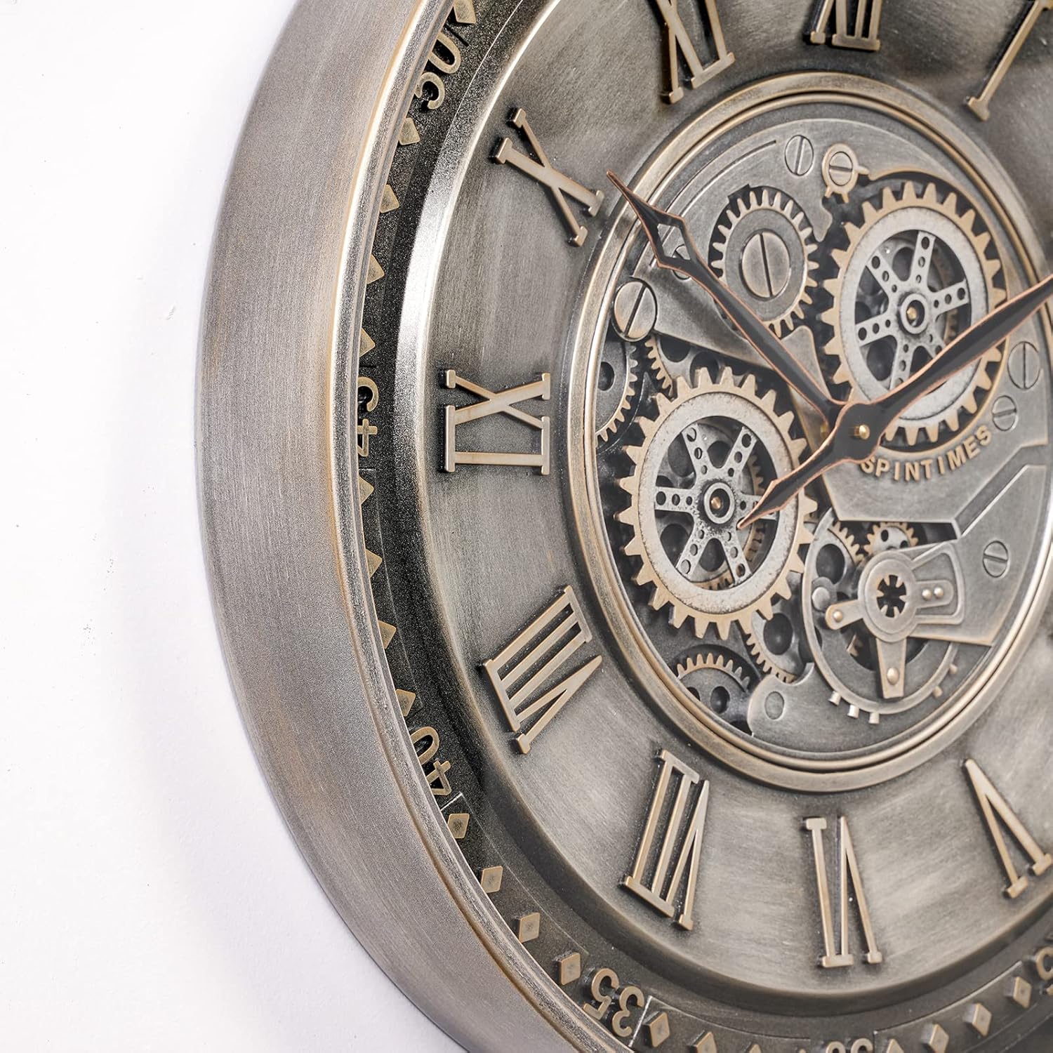 CLXEAST 24 Inch Large Moving Gear Wall Clock for Living Room Decor, Antique Silver Metal Roman Numerals Wall Clocks for Home Office