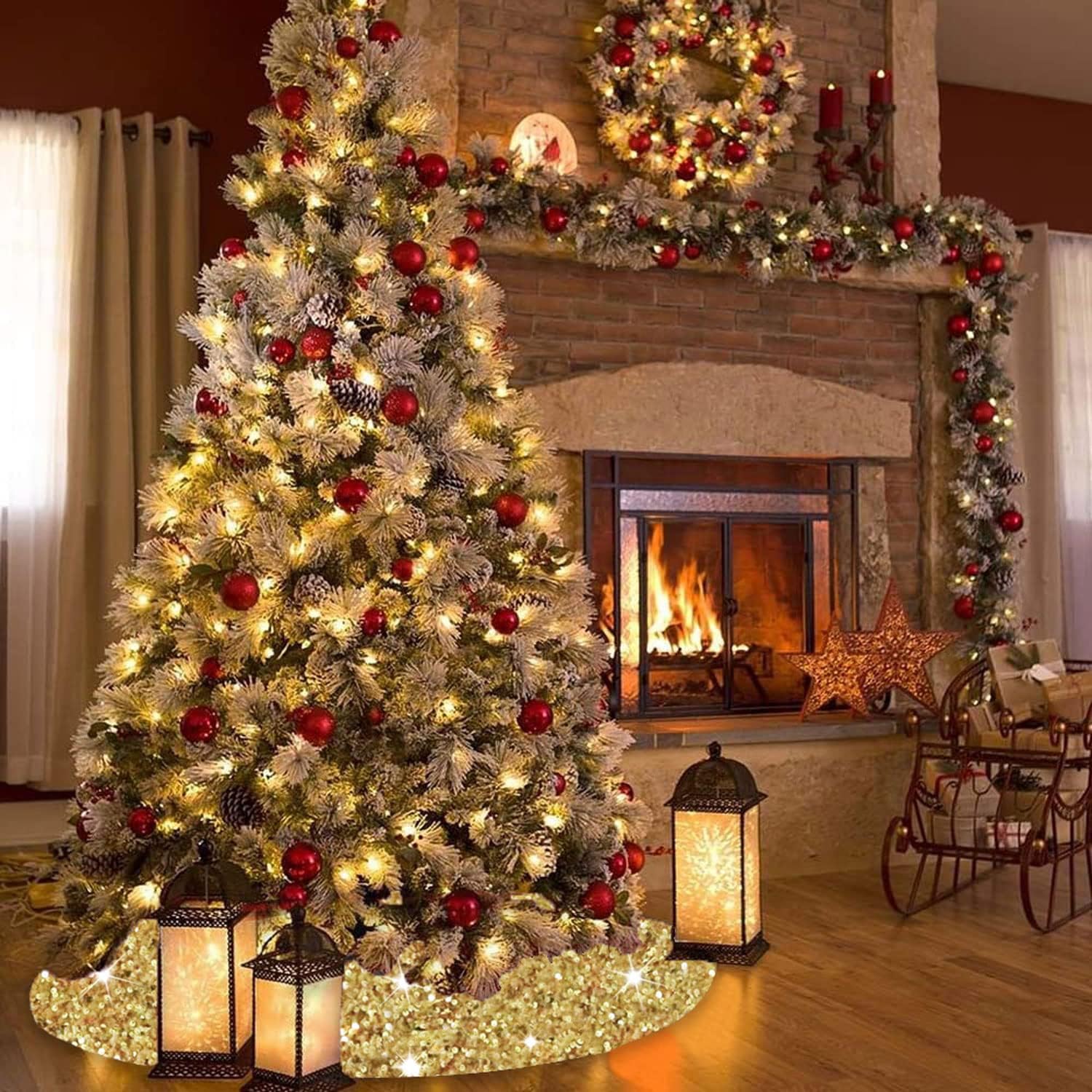 - âď¸ăSize Detail - Sequin Tree SkirtăYou will receive a 46 inches diameter gold glitter sequins tree skirt, fits under 8 foot tall trees. You can put some gifts, Christmas boxes, Christmas ball on the xmas tree cover mat. The sparkle velour Christmas tree skirts is perfect for decorating your home and become part of your holiday tradition.