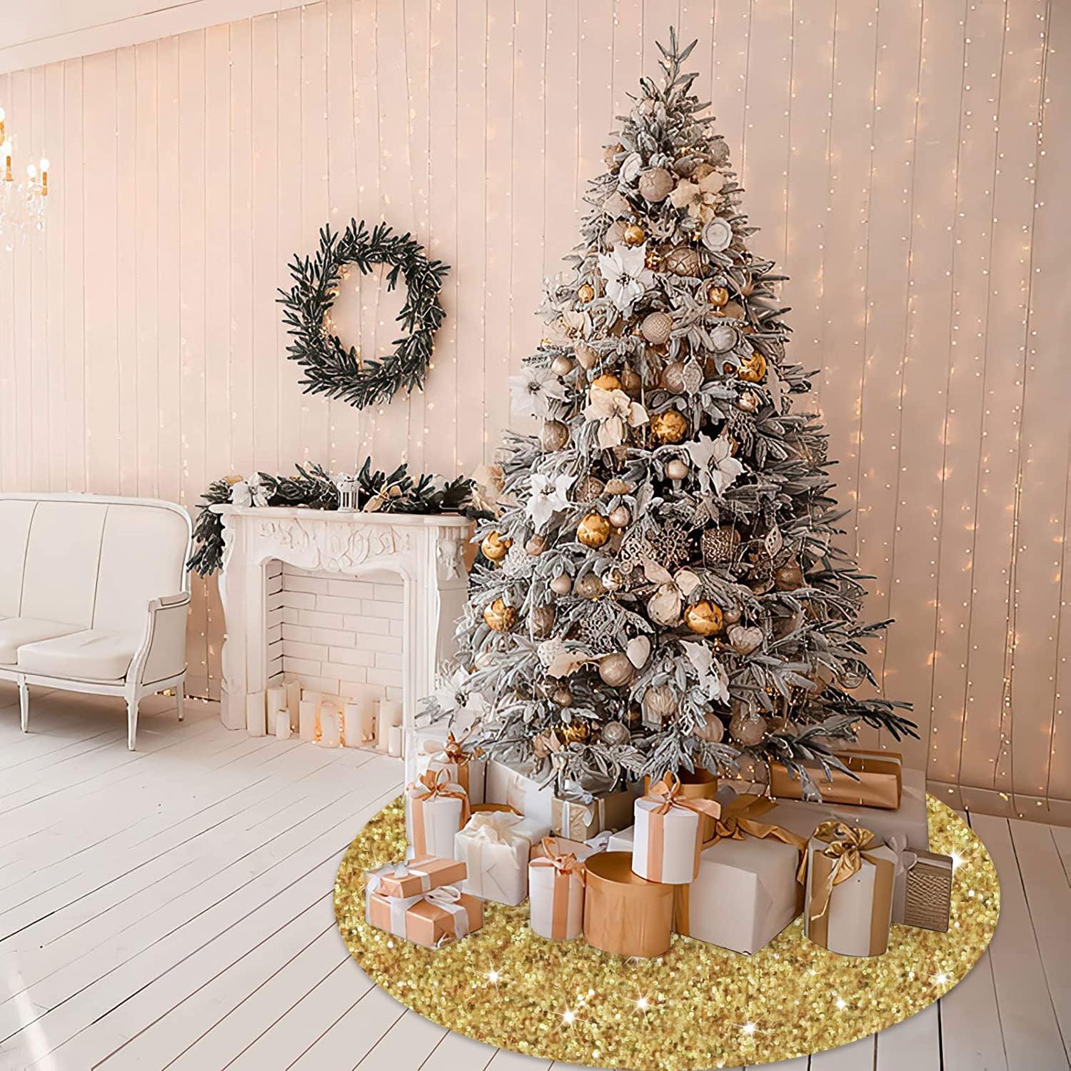 - âď¸ăWidely Application - Gold Tree Skirt Christmas DecorationsăThe round tree skirt great for indoor and outdoor tree decorations, suitable for modern and traditional home style. Great for living room, office, theme party, classroom, supermarket, garden, bar, hotel, and any other scenes. Bring warm and comfortable atmosphere into your home.