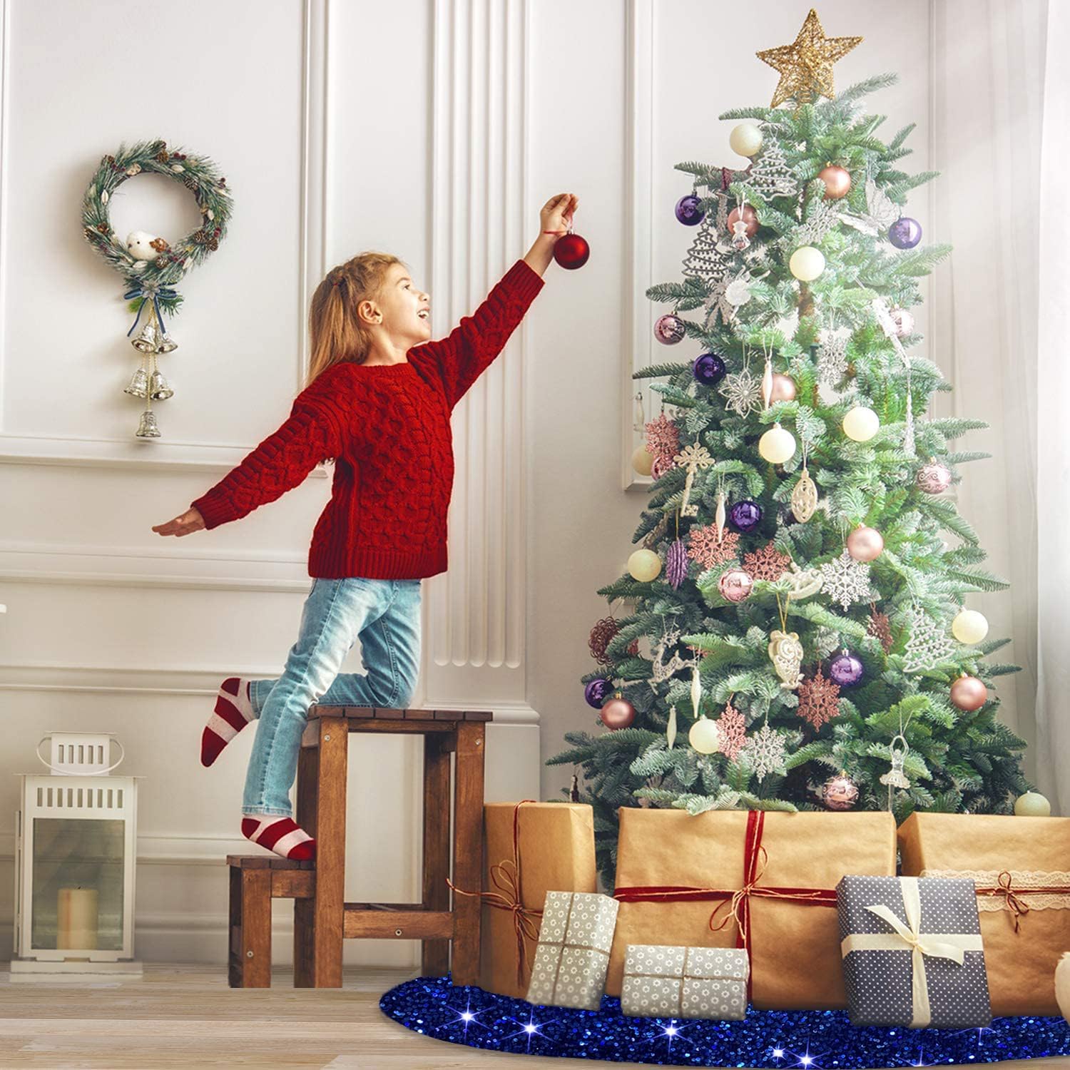 - âď¸ăSize Detail -36 Inch Sequin Tree SkirtăYou will receive a 36 inches diameter royal blue glitter sequins tree skirt, fits under 6 foot tall trees. You can put some gifts, Christmas boxes, christmas ball on the xmas tree cover mat. The sparkle velour Christmas tree skirts is perfect for decorating your home and become part of your holiday tradition.