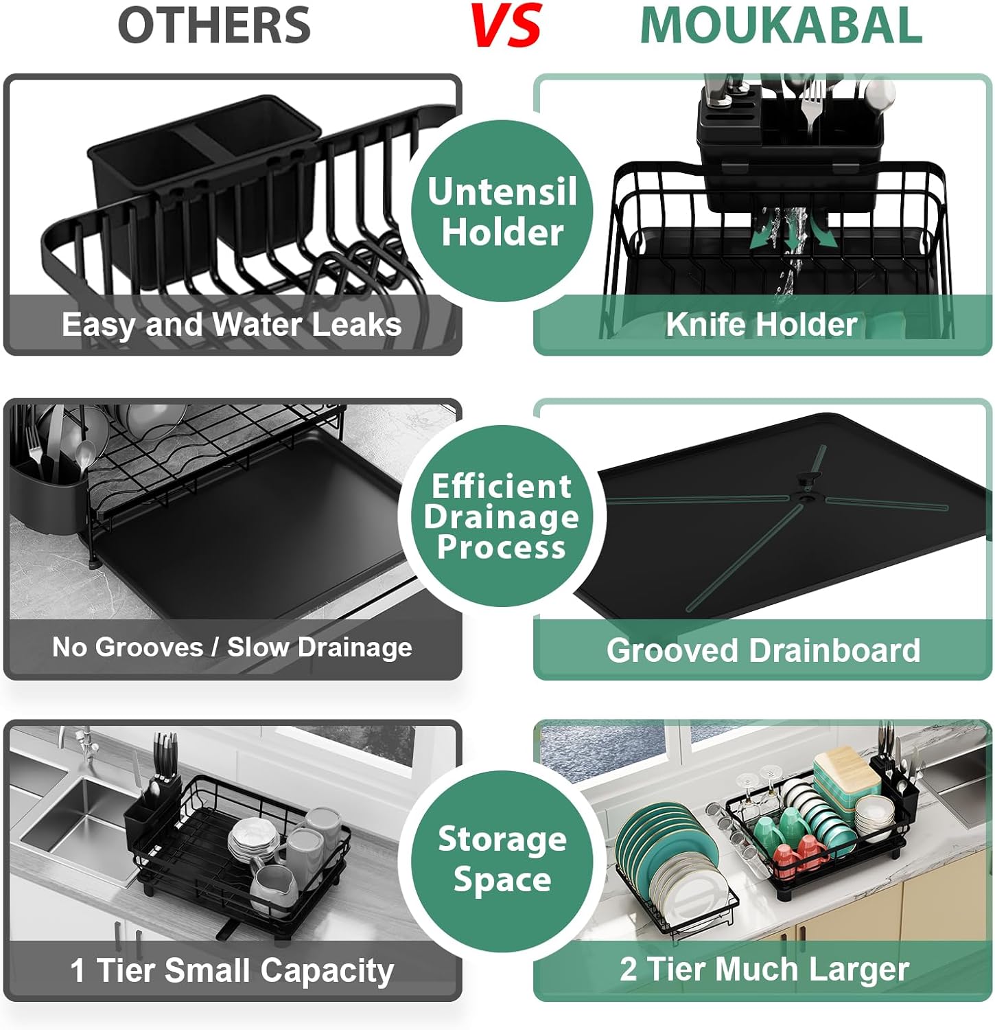 MOUKABAL Dish Drying Rack, 2 Tier Dish Rack, Large Dish Racks for Kitchen Counter, Dish Drainer with Removable Utensil Holder, Drainboard (Black)