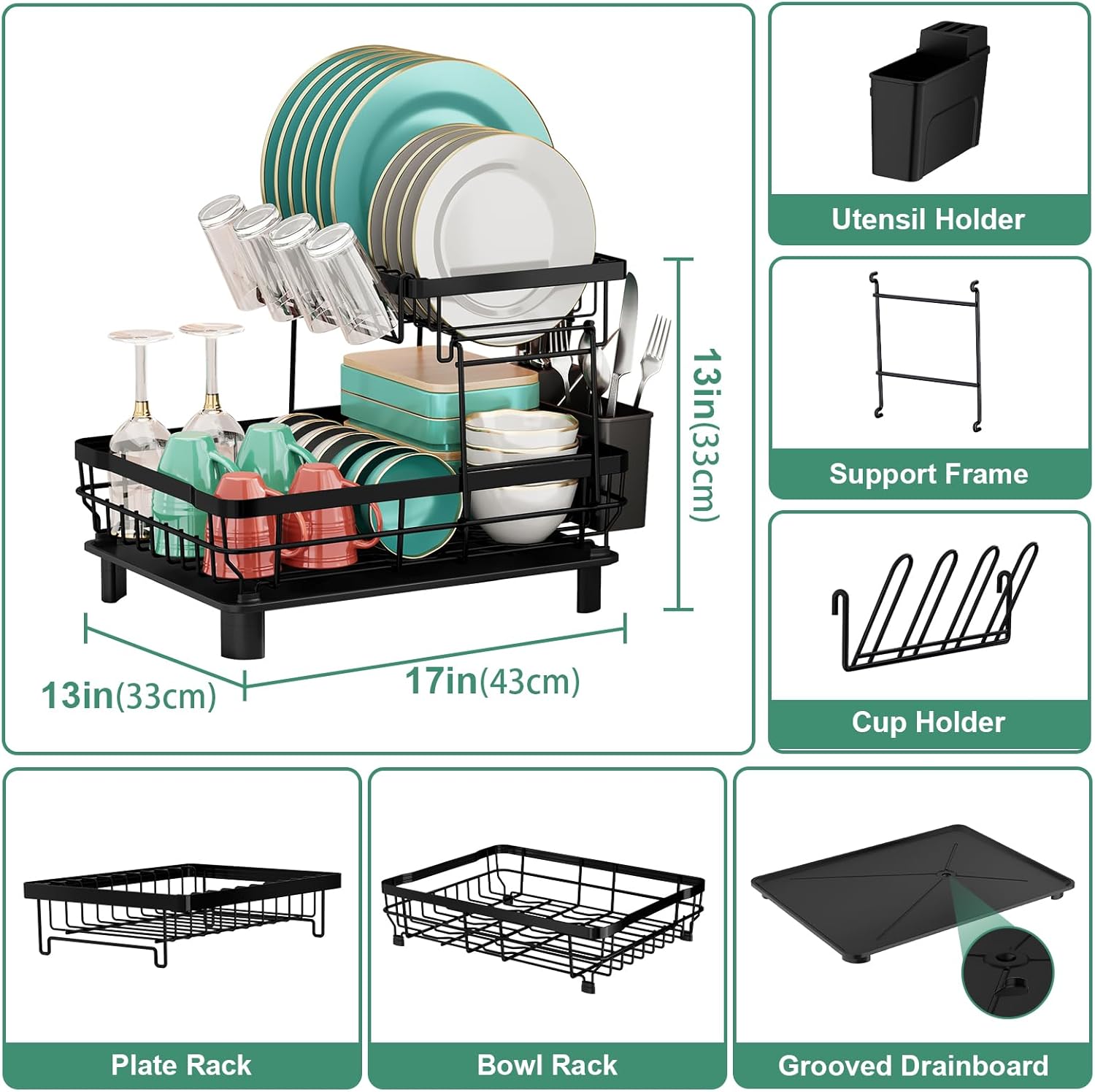 - π ππππ πππππ ππππππππ:Our dish racks measures 16.9"D x 12.9"W x 12.9"H(43 D x 33W x 33 H cm),with plate rack,bowl rack,cup holder and silverware organizer store 10 plates,16 bowls,12 cups or glasses and lots of tableware,the dish drainers for kitchen counter is large enough for a family of 6 to use daily