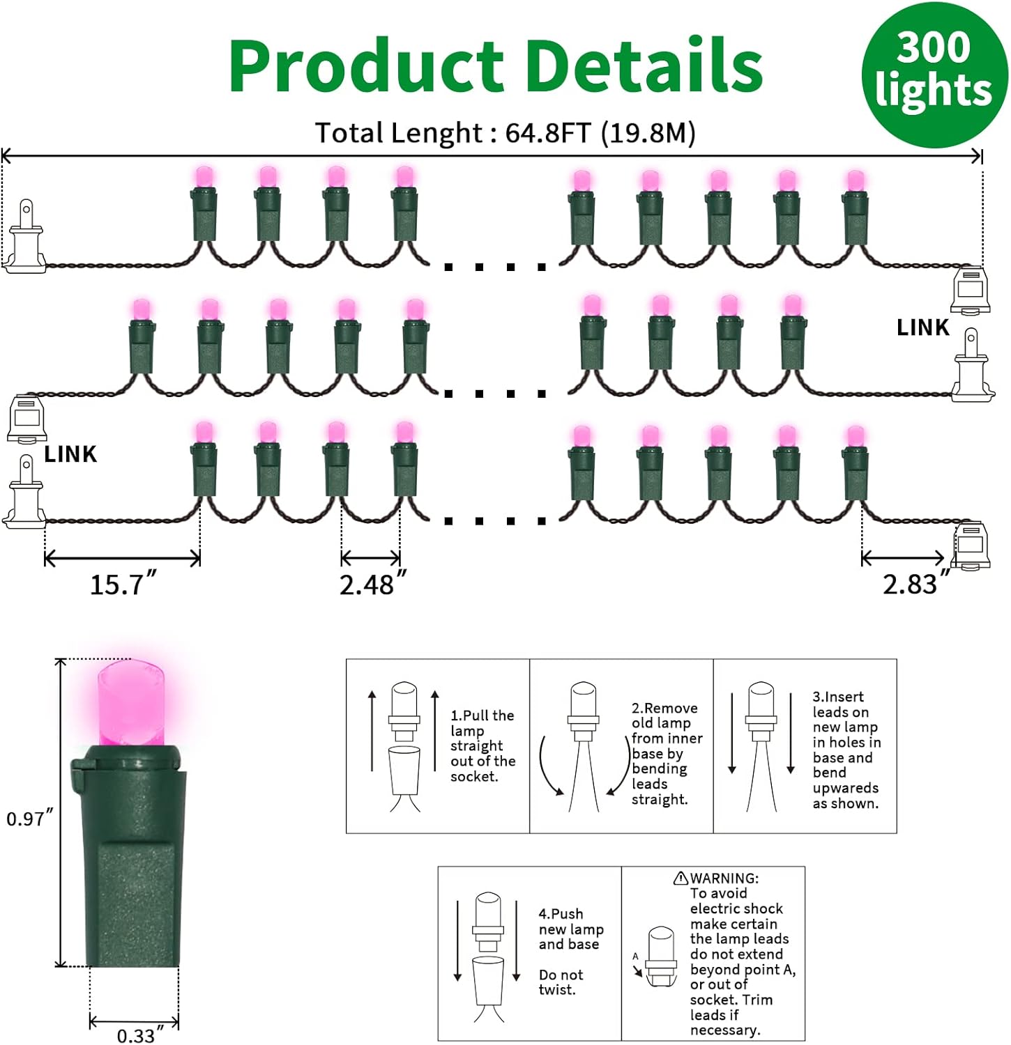 - 3 STRANDS IN 1 PACK: 64.8ft 300 LED Lights (100 Lights 21.6ft 3 Groups), 5mm wide angle stable LED string lights spaced 6.3 inches apart with green wire.