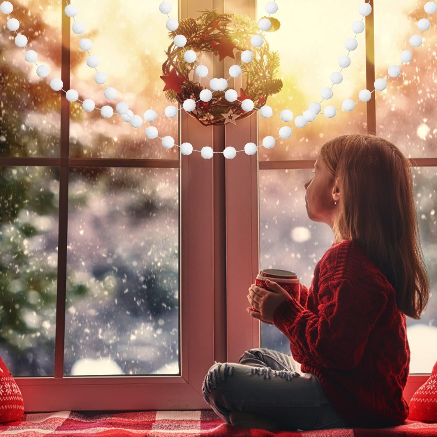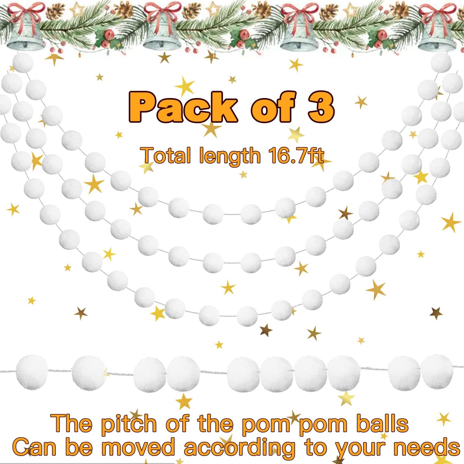 - WHITE SNOWBALL CHRISTMAS GARLAND PACK OF 3: Each Felt Ball Pom Pom Garland contains 24 Pom Pom Balls, 6.6 feet/ 2m long and the Pom Pom Ball is 25mm in diameter, no knots in the felt pom pom garland, so the distance between the felt balls and the length of the garland can be adjusted. Jishi 3 strands of elegant felt ball garland set will meet your daily, festive holiday, christmas, birthday and parties decoration needs. NOTE: Winding Risk May Exist, Please Keep Away from Kids Under 3 Years Old.
