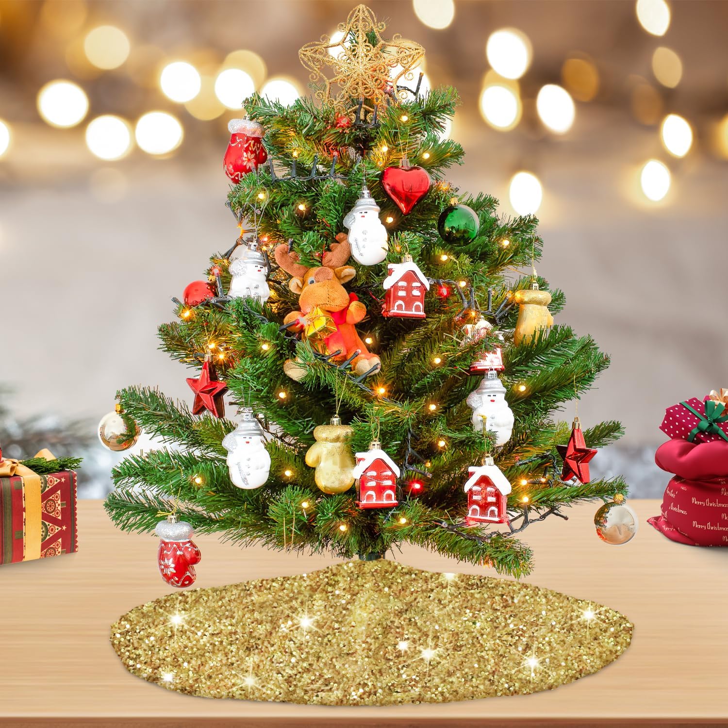 - âď¸ăSize Detail - Metallic Tree SkirtăYou will receive a 21 inches diameter gold glitter sequin tree skirt, fits under 3 foot tall trees. You can put some gifts, Christmas boxes, christmas ball on the xmas tree mat. The sparkle velvet Christmas tree skirt is perfect for decorating your home and become part of your holiday tradition.