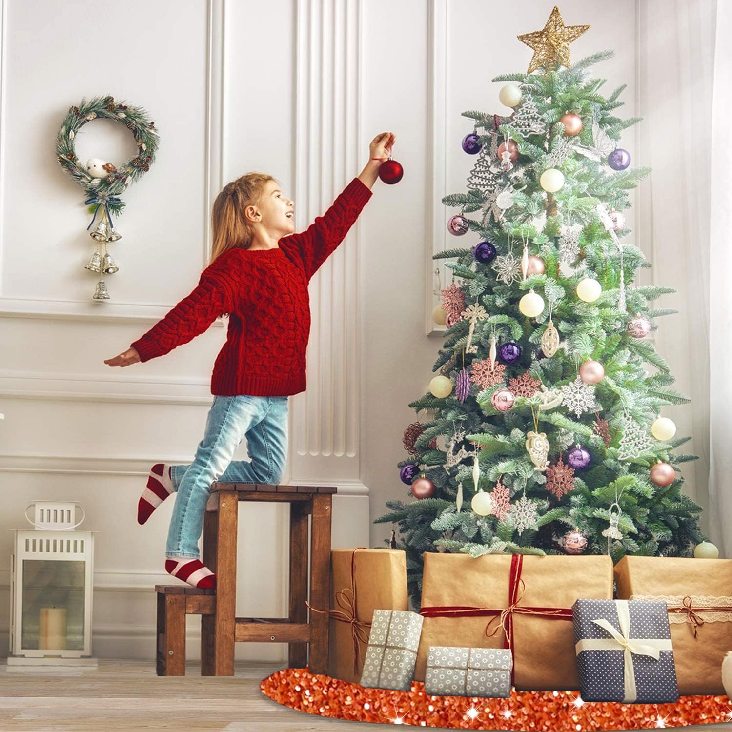 - âď¸ăSturdy Material - Orange Christmas Tree SkirtăOur Chritmas sequin tree skirts are made of premium 5mm sequin fabric and thick velvet material, which can show bright color at any angle. Different from the traditional sequin Christmas tree skirt, this Christmas tree mat won't fall off sequins, more elegant and shiny, adding festive fun to your home.
