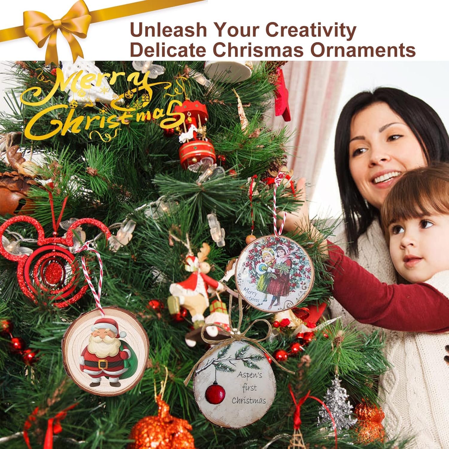 - Unfinished wood slice ornaments: Our natural pine wood slices kit includes 32 predrilled wood rounds with jute rope 33ft, red-and-white cotton rope 33ft and 5 colored pens. Wood pieces are approximately 2.8-3.1 inches in diameter and 0.4 inches thick. You can personalize wood circles by drawing and writing with the complimentary 5-color pen to make them ideal decorations for holidays such as Easter, Christmas, Halloween or various parties such as wedding, birthday and baby shower