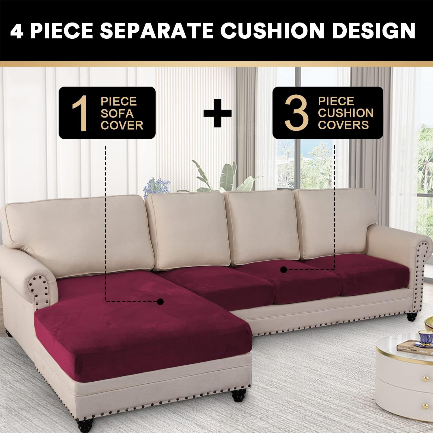 PrinceDeco Velvet Couch Covers - 4 Piece Set for Sectional Sofa (3 Seater + 1 Chaise, Burgundy)