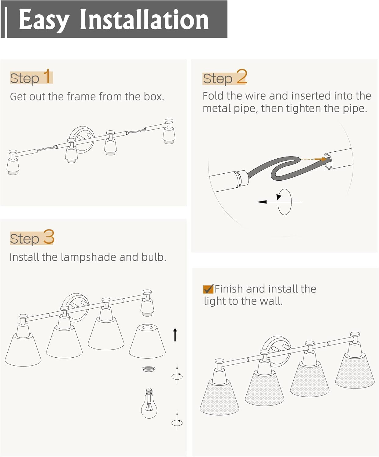 - 【Bulb Requirements】Support any E26 base bulbs ( Max 60W/each, bulbs are not included). This bathroom vanity light is also designed to be dimmable when used with a dimmable bulb and compatible dimmer switch.