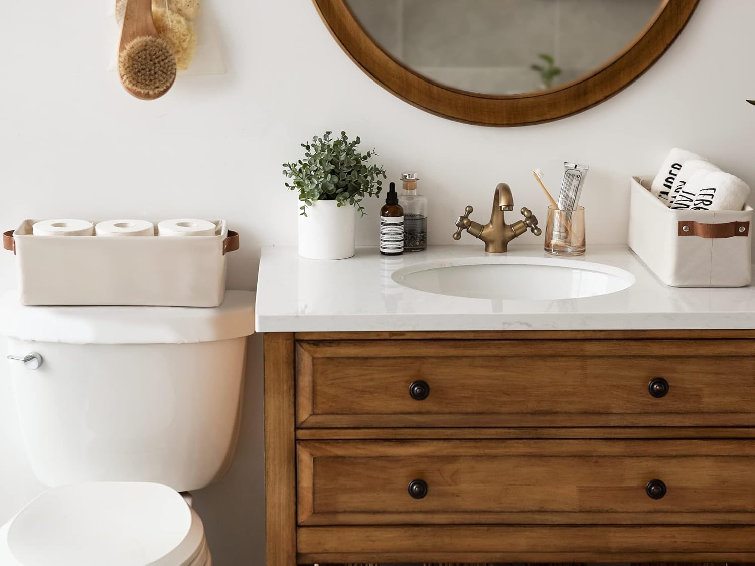 - The sleek modern design with 2 widened PU handles makes this small basket a great addition to any home.