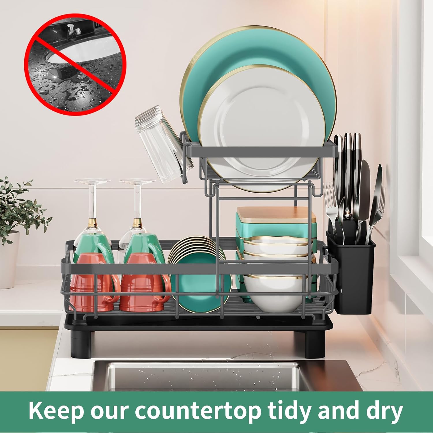 MOUKABAL Dish Drying Rack, 2 Tier Dish Rack, Large Dish Racks for Kitchen Counter, Dish Drainer with Removable Utensil Holder, Drainboard (Grey)