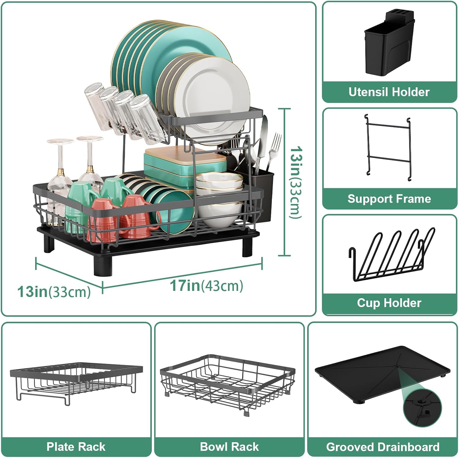 - π ππππ πππππ ππππππππ:Our dish racks measures 16.9"D x 12.9"W x 12.9"H(43 D x 33W x 33 H cm),with plate rack,bowl rack,cup holder and silverware organizer store 10 plates,16 bowls,12 cups or glasses and lots of tableware,the dish drainers for kitchen counter is large enough for a family of 6 to use daily