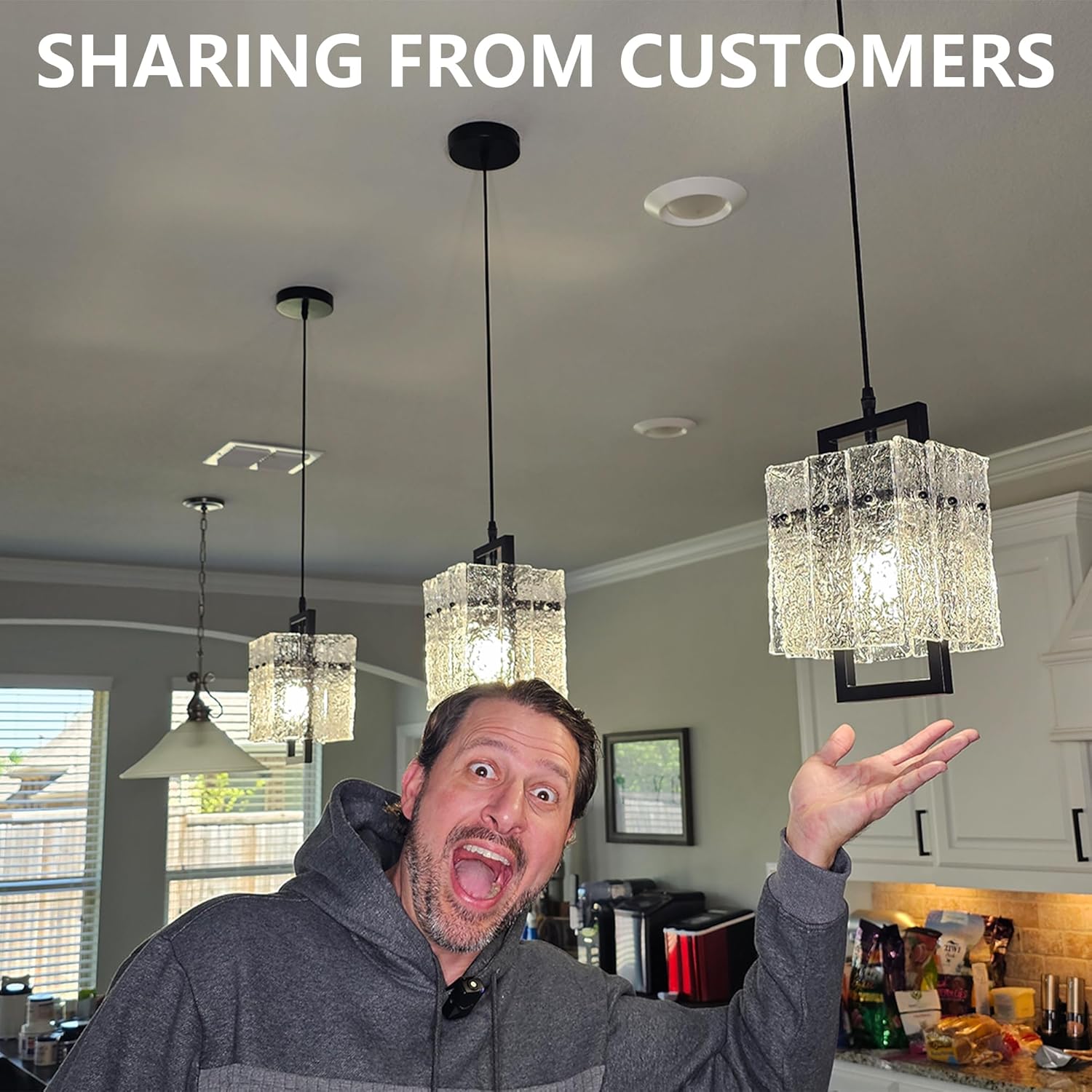 - [BRING NATURE HOME ]: This gorgeous modern pendant lights kitchen island with 100% handcrafted water ripple glass. The Nature-inspired accessories can strengthen the calming power of your home. Each glass is unique, mimicking the calming, restorative ambiance of the outdoors.