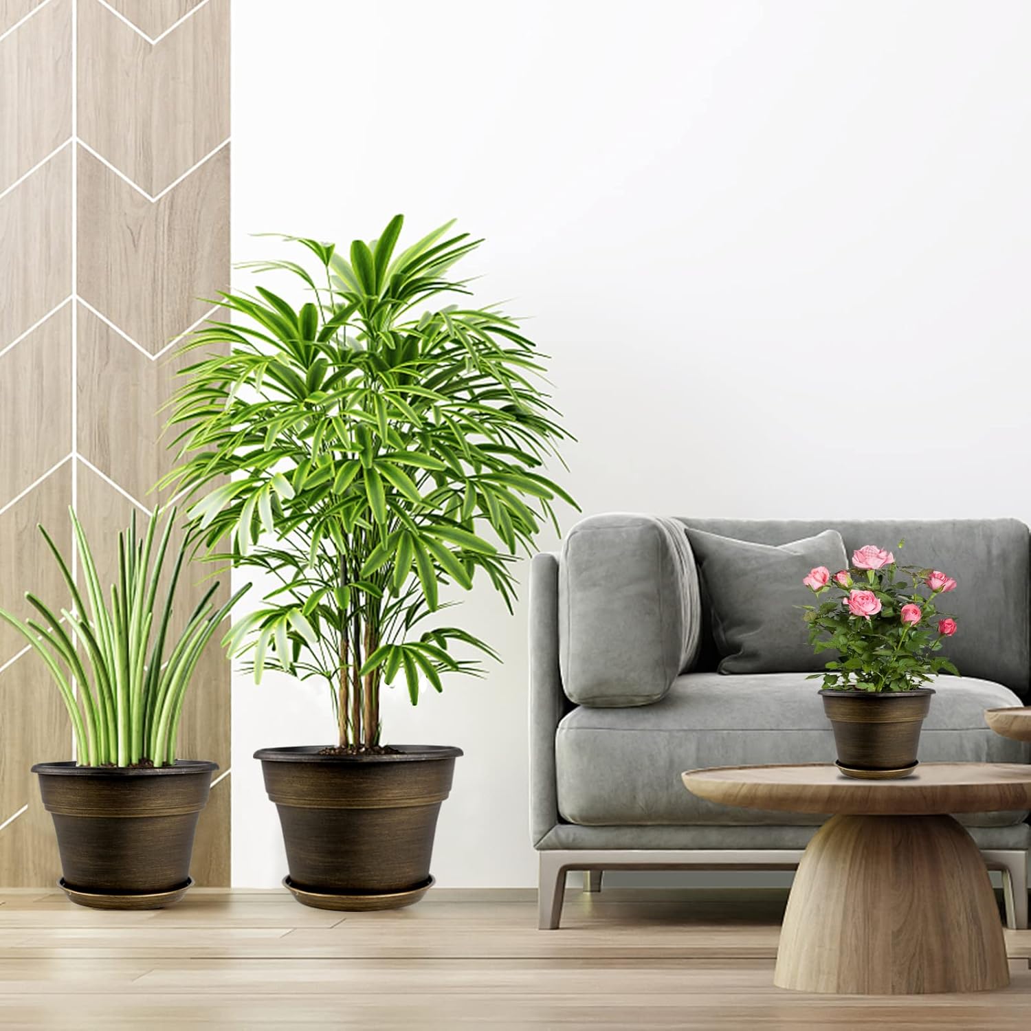 - 【TRADITIONAL DESIGN】Plastic planters for indoor plants with trays are designed in dark gold colors & a classic round look, which allow this pot to fit into any indoor & outdoor setting. With these golded flower pots, it could adds fresh, decorative flair to your home. Decorate your windowsill, desktop, shelf, bedroom, living room, kitchen, garden, office with our 9 inch plastic plant pot.