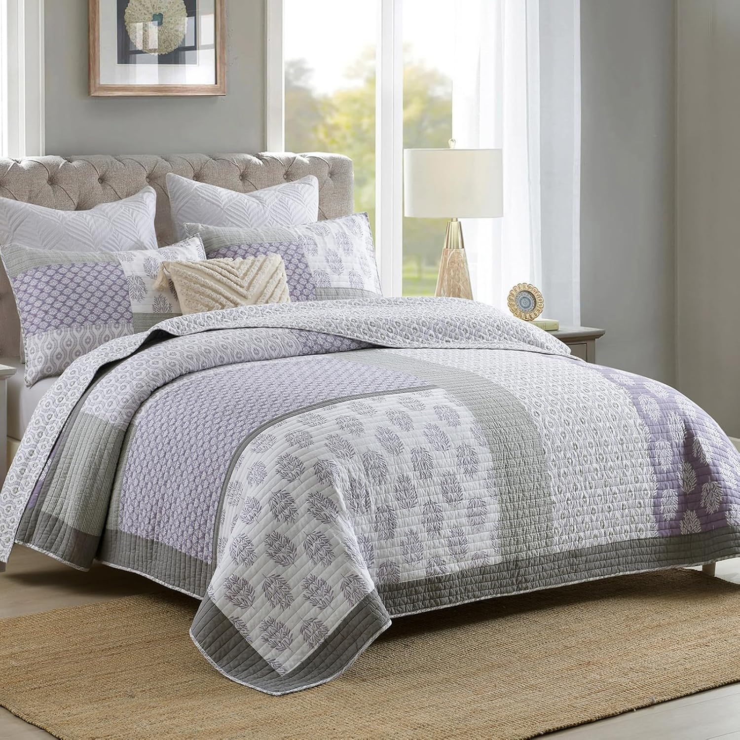 PANGUSHAN Quilt Set Queen Size, 100% Cotton Bedspread Quilt Bedding Set, Patchwork Reversible Floral Quilt for Queen Bed, Purple/Grey/White Bed Spread, Lightweight Comforter for All Season, 3 Pieces