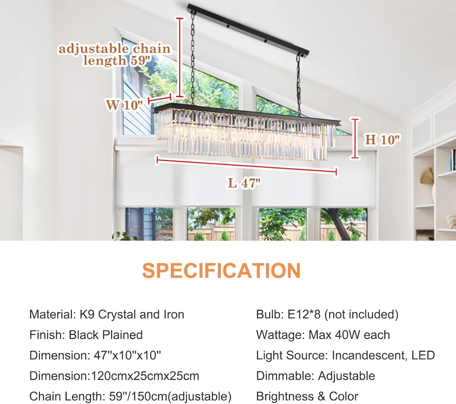 - [Large Pendant Light]: The rectangle chandelier measures L47" x W10" x H10", with a chain length of 59" (150CM, adjustable); The total height range of the chandelier is 13.7'' to 70.8'' (35cm-180cm). This makes it flexible and adaptable for hanging above kitchen island, dining table, living room or bar area, etc.
