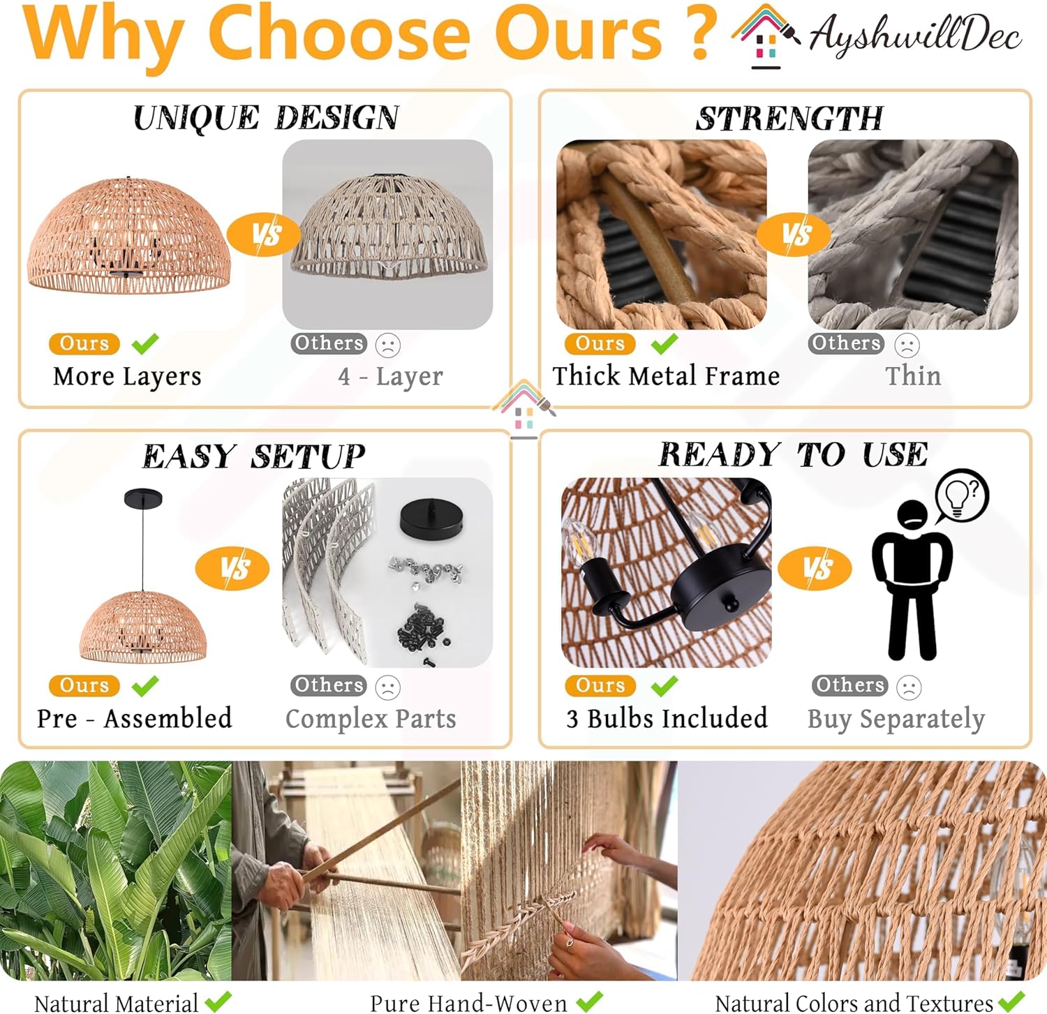 - [Unique style] This brown woven chandelier is woven with hemp rope. When switched on, the light emits a soft and pleasing glow through the hemp rope, bringing a relaxing and cosy ambience to any part of your home and will give you a different kind of surprise.