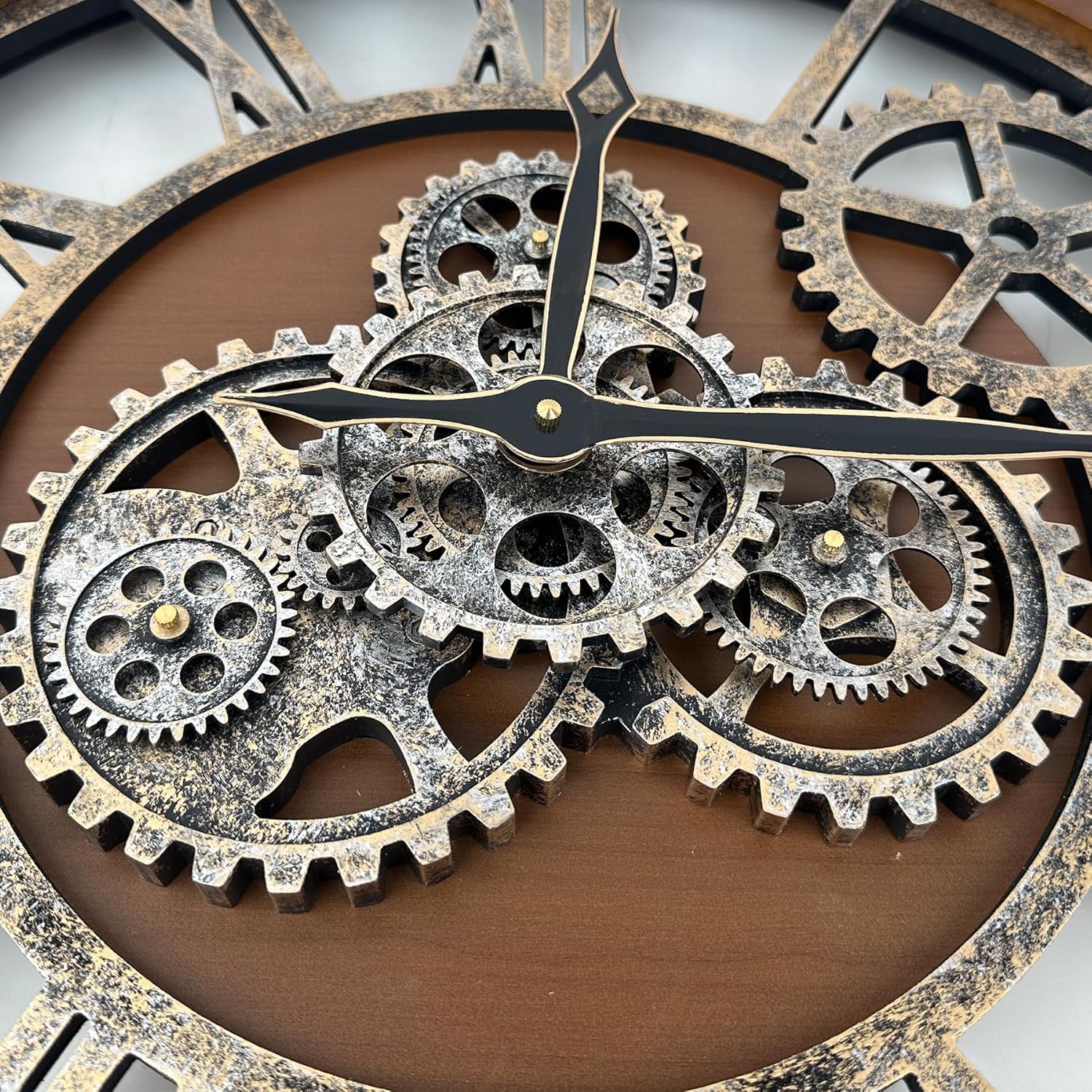 - REAL MOVING GEARS: Large wall clock with unique moving parts is as attractive as it is functional. Put batteries in, various gears start rotating fluently. Moving gear wall clock is amazing looking on the wall and will get so many compliments on it. Made from solid wood and painted by Rust-like color on wall clock create a very rustic and industrial atmosphere. Large farmhouse wall clock is professionally handmade and pursuit of naturalness, so it may have some little imperfections