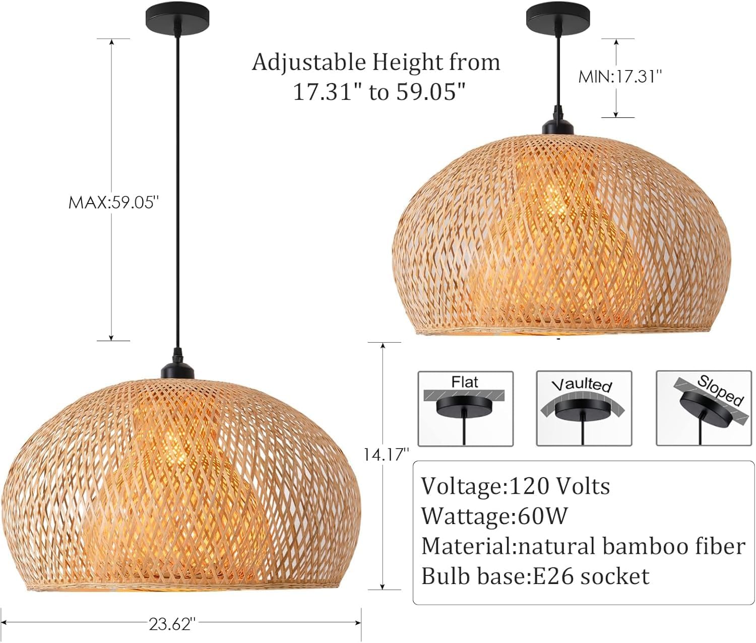- 【BULB REQUIREMENT】Bamboo Pendant Light, size 60*36 cm/23.62*14.17", Voltage 110v~240v, Bulb socket and electric cord have passed the UL listed, which can ensure that you use them safely. US standard E26 base socket, maximum 60 W, suitable for Incandescent, LED, halogen, CFL, etc.(Bulb Not included)