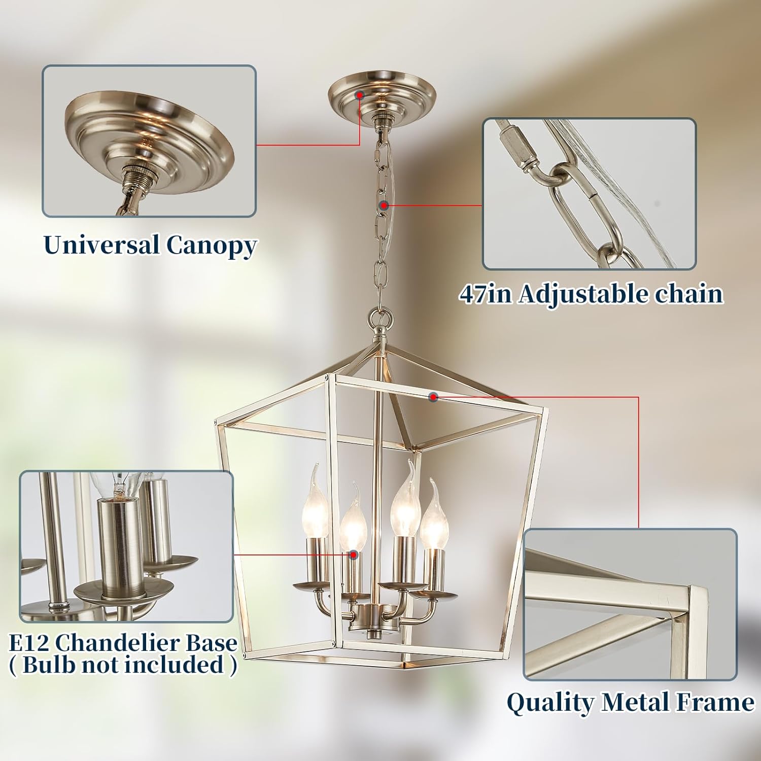 - Easy to Install:The frame of this brushed nickel lantern chandelier needs to be assembled. It is made of Sturdy and safe copper wire. The installation is very simple and takes only a few minutes to light up your room