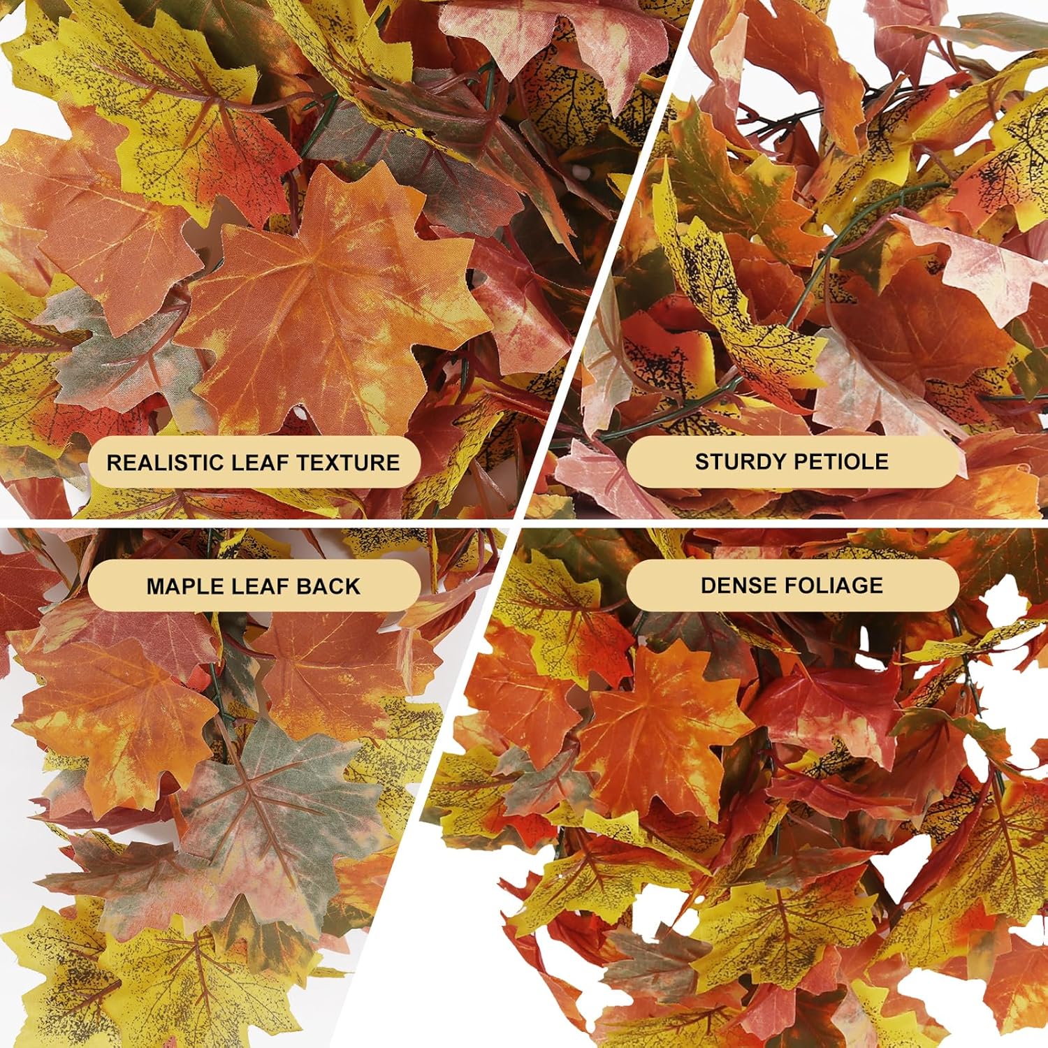 - [Material of Fake Maple Leaf]The fake maple leaf plants decoration is mainly made of quality silk cloth leaves with green color,detachable,durableand and the stem is embedded with iron wire inside,they have a realistic appearance and are close to nature .Faux maple leaves garland is perfect for indoor or outdoor decor.