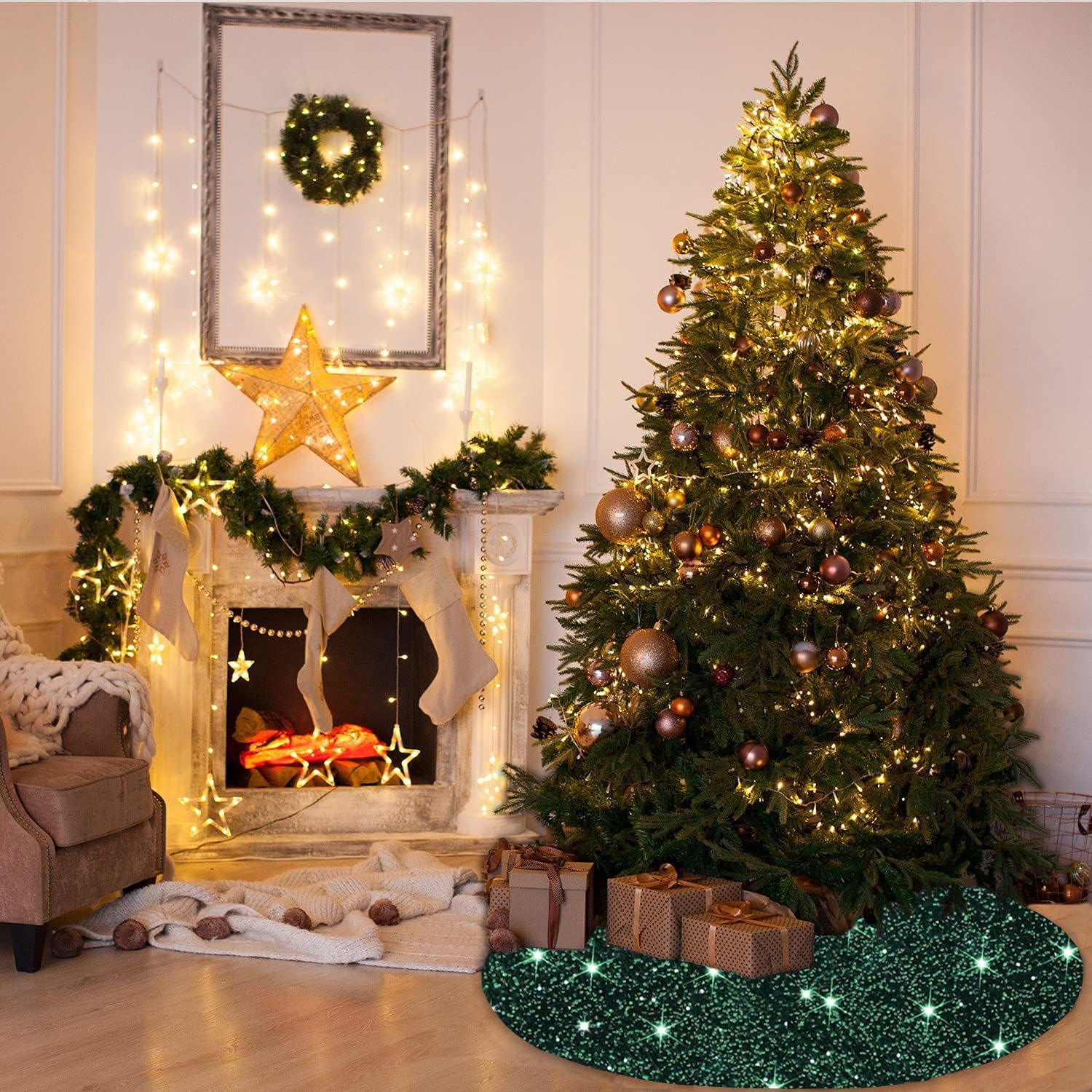 - âď¸ăSize Detail - Velvet Tree Skirt for ChristmasăYou will receive a 21 inches diameter green black glitter sequins tree skirt, fits under 8 foot tall trees. You can put some gifts, Christmas boxes, Christmas ball on the xmas tree cover mat. The sparkle velour Christmas tree skirts is perfect for decorating your home and become part of your holiday tradition.