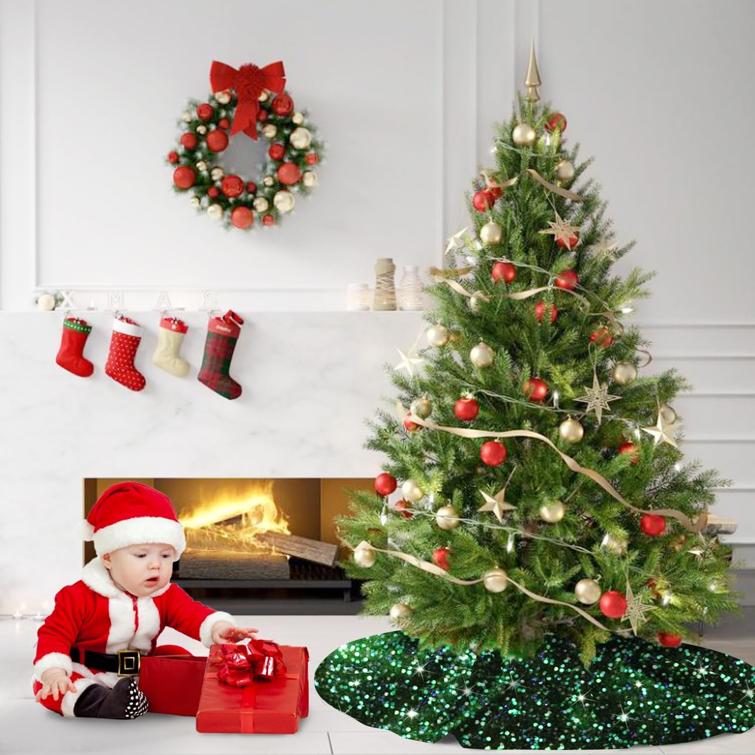 - âď¸ăSize Detail - Velvet Tree SkirtăYou will receive a 46 inches diameter green black glitter sequins tree skirt, fits under 8 foot tall trees. You can put some gifts, Christmas boxes, Christmas ball on the xmas tree cover mat. The sparkle velour Christmas tree skirts is perfect for decorating your home and become part of your holiday tradition.