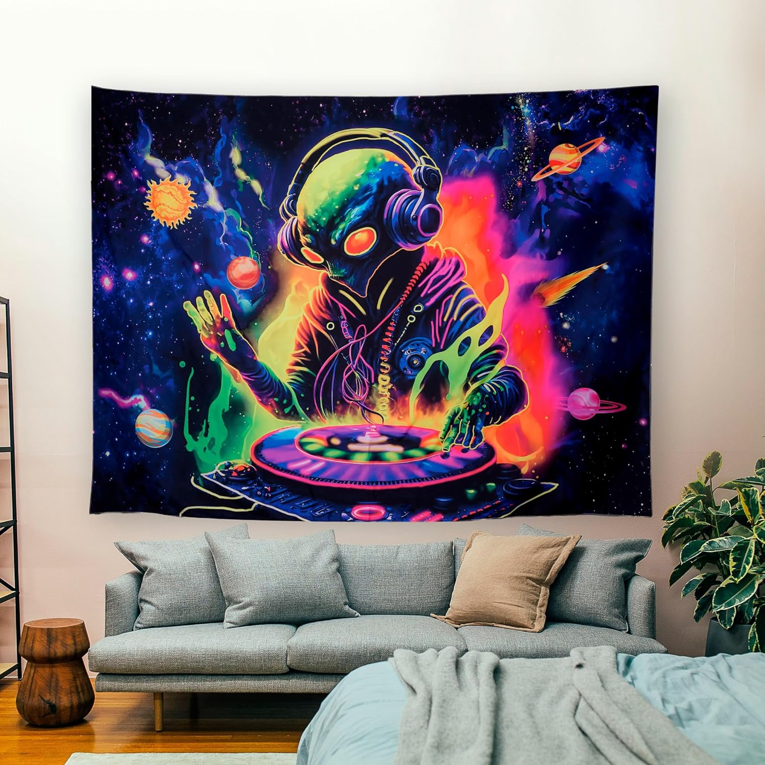 - Blacklight/UV Reactive: With special ink and advanced sublimation printing tech, our alien DJing wall tapestry can glow gorgeously under blacklight or UV light in the dark. The alien tapestry looks amazing and fabulous under black light, UV light, LED light or Neon. Besides, the pattern is also clear and gorgeous even under normal lighting due to our HD print tech.