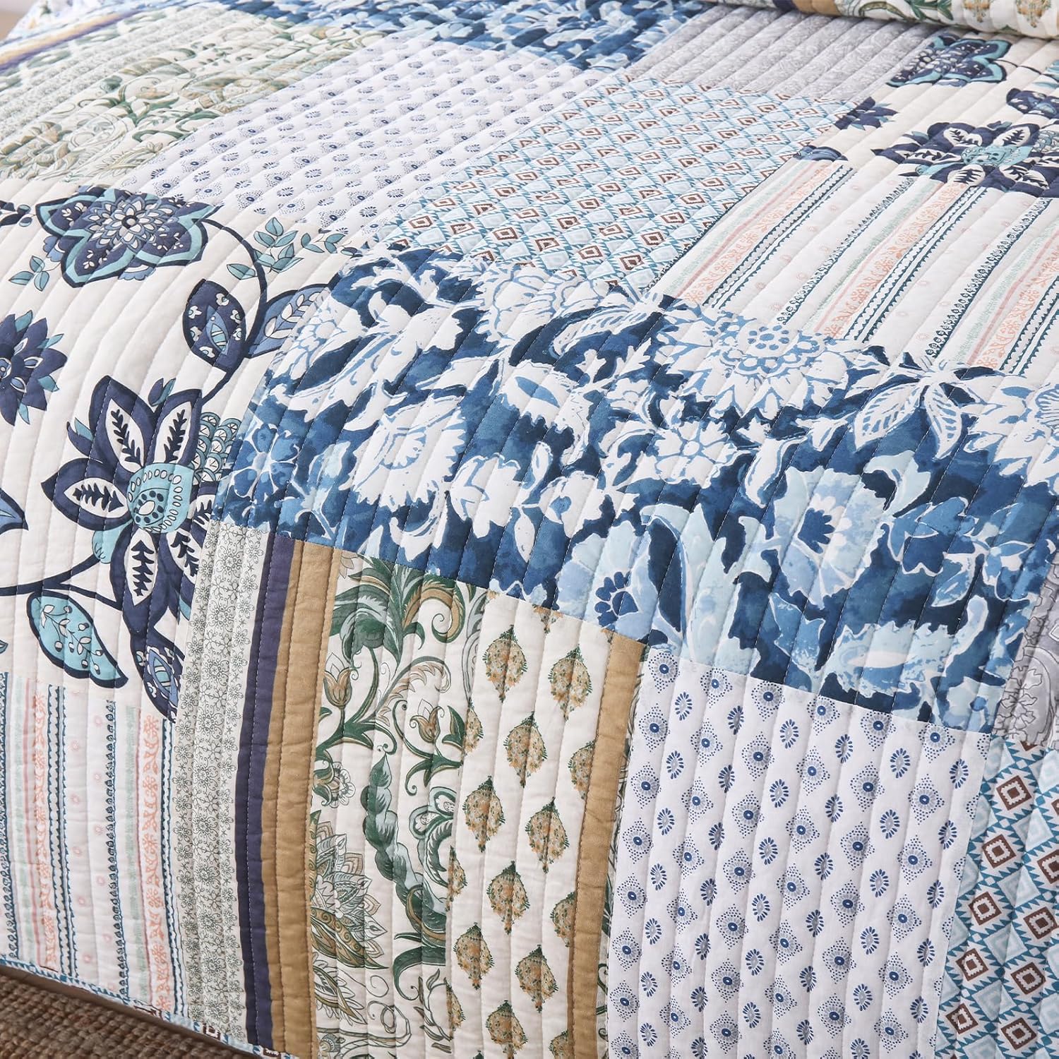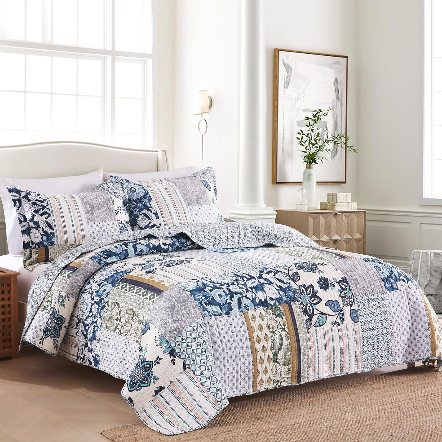 - UNIQUE QUILT SET: The real patchwork quilt set is made of different patterns pieces sewn together. Its A side is designed with paisley floral patchwork and its B side with bohemian diamond. The special design fits for any decoration and will brighten your room.