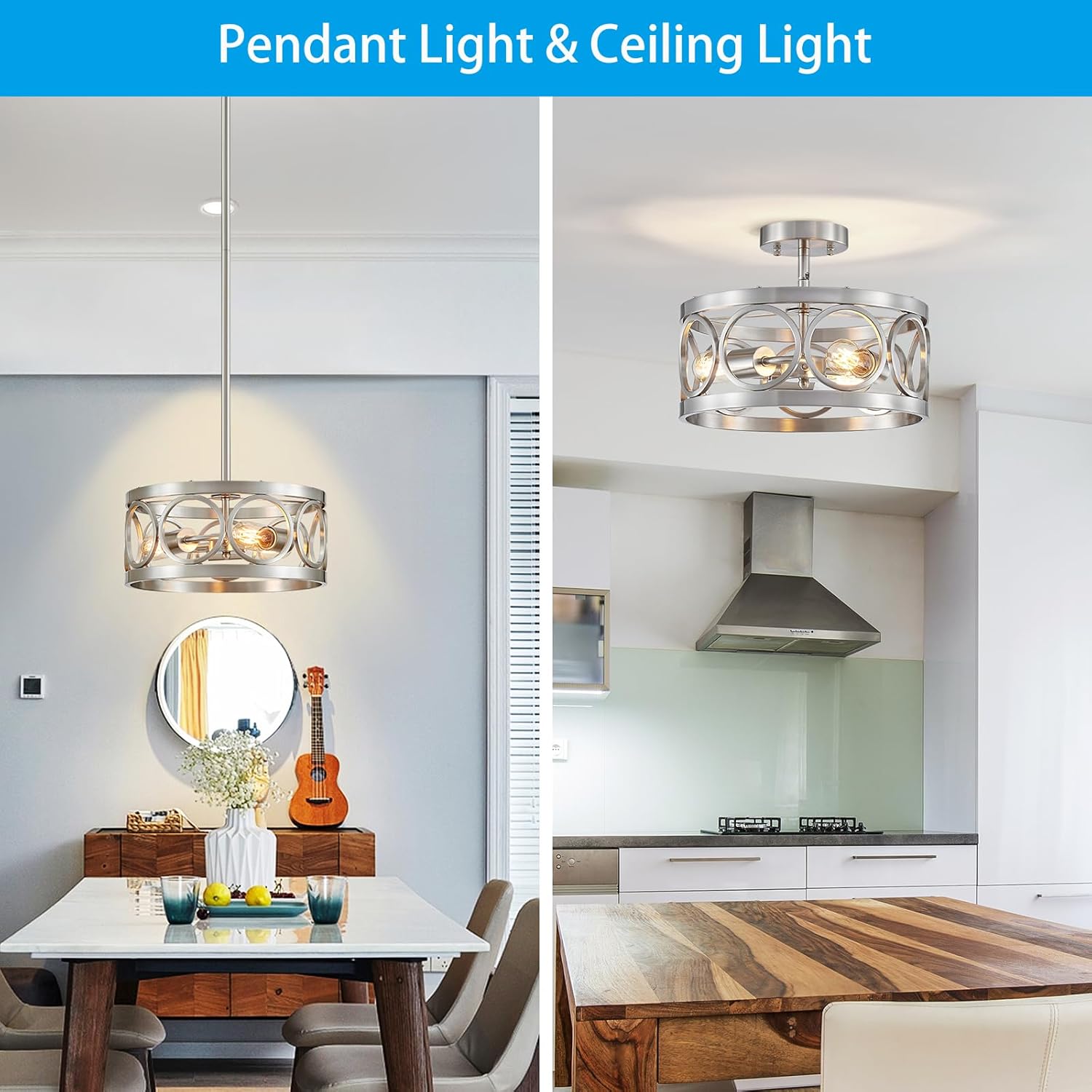 - [EXQUISITE DESIGN]: Make your dining room look stunning with this farmhouse chandelier. Its unique open drum frame, with brushed nickel finish, adds a touch of rustic charm to any decor style. Unlike plastic chandeliers, this 1 is made of durable metal and is sure to impress.