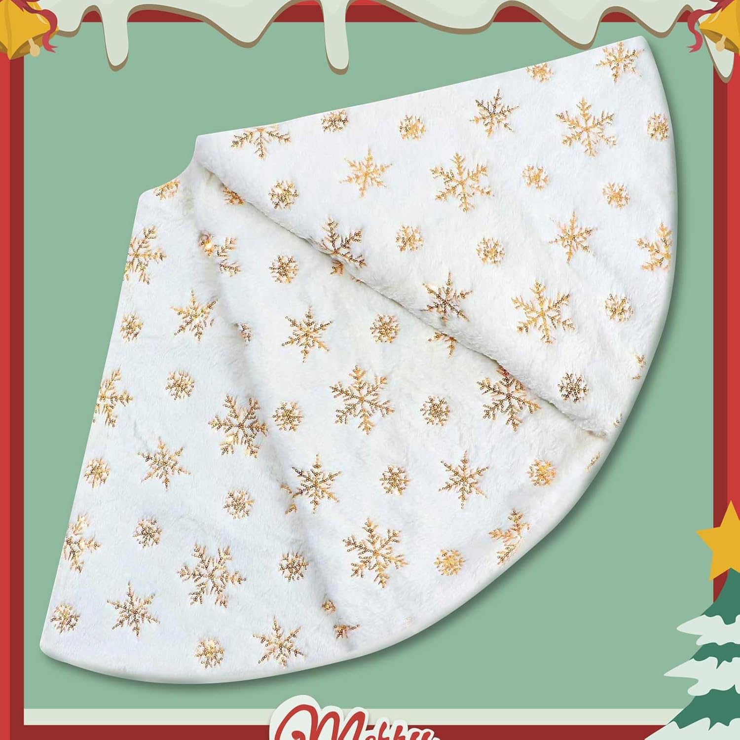 - Ideal Christmas decoration: Double layer design, back with non-woven fabric and front with Short faux fur. There are many gold sequined snowflakes on the white christmas tree skirt, like snow falling on the ground.