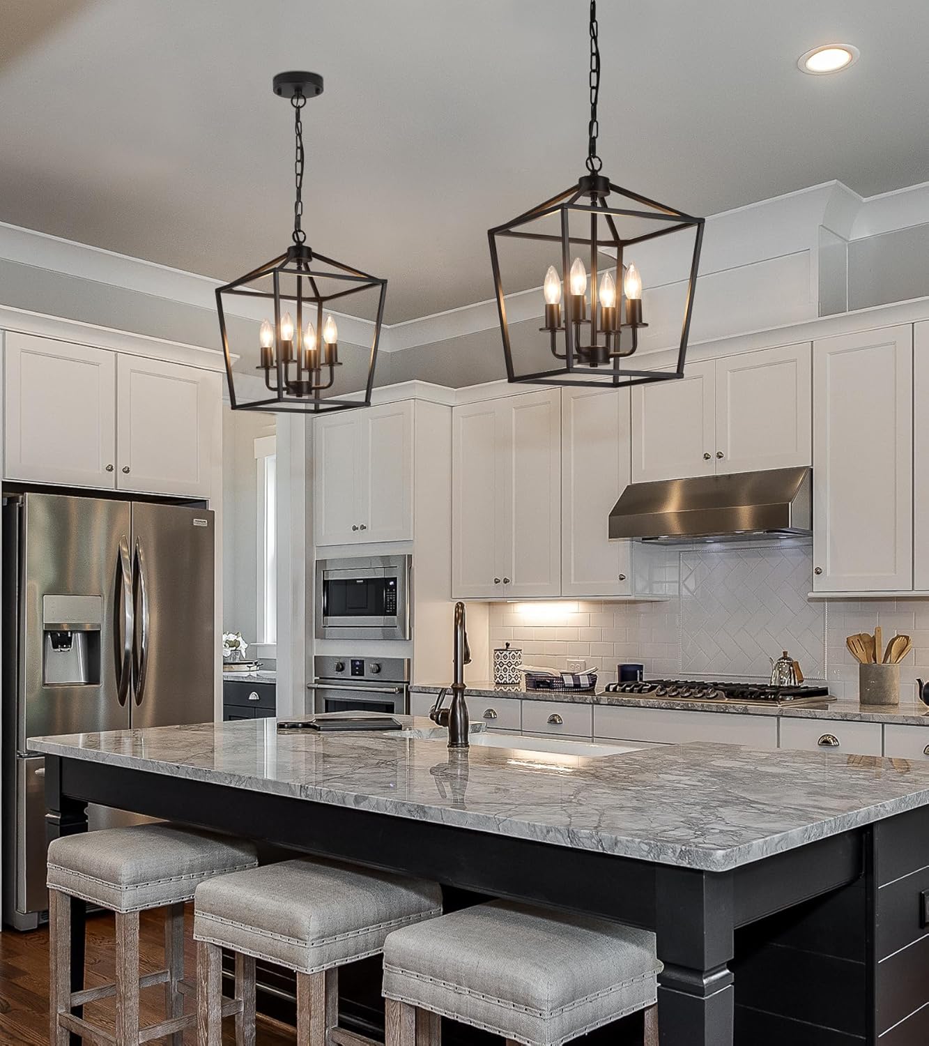 - Easy to Assembly:The kitchen table lantern pendant light is easy to install,this black farmhouse chandelier with adjustable chain,you can adjust the length of the chain according to the height you want also with detailed installtion instructions.It can be install for a sloped,flat,vaulted ceilings.